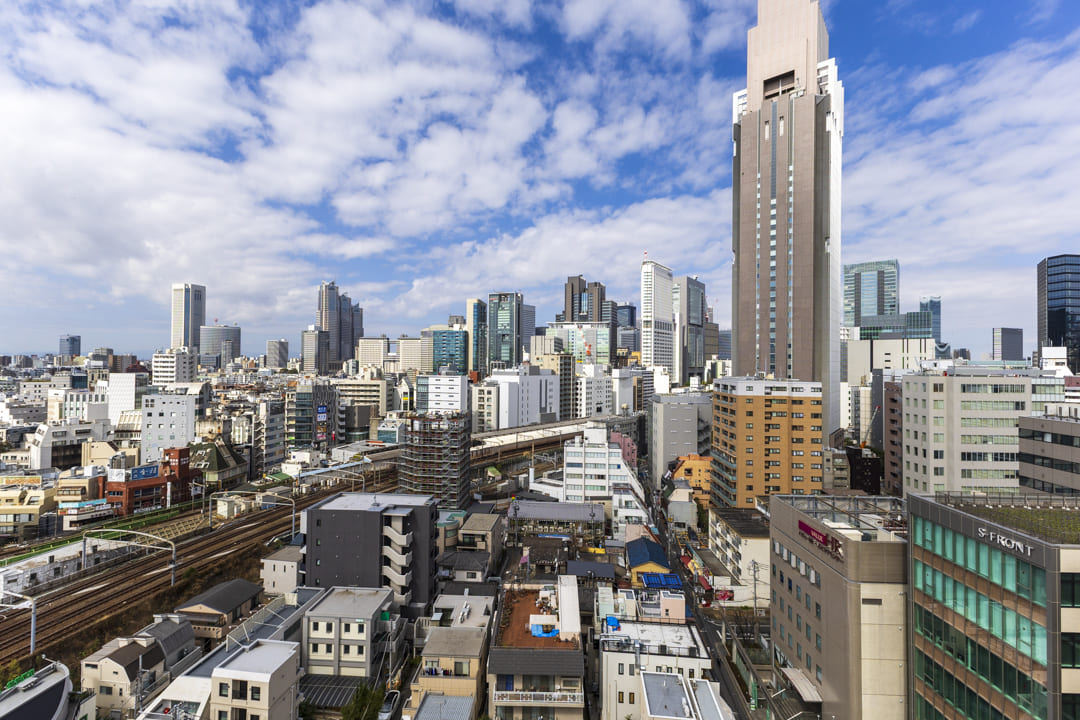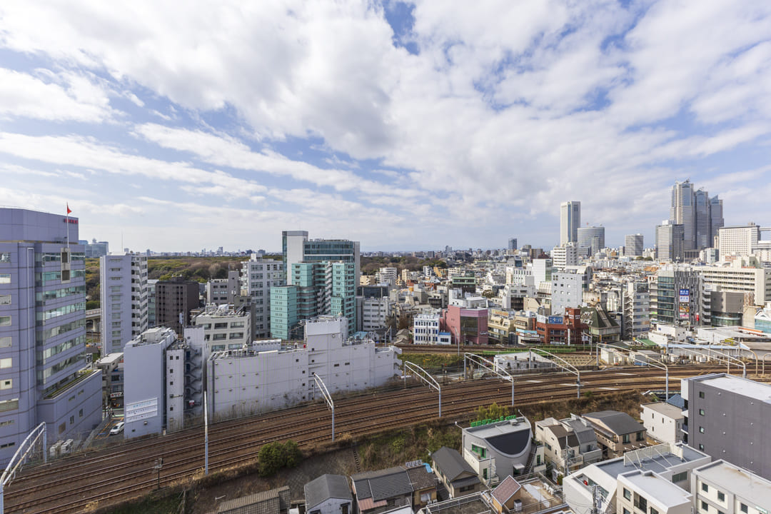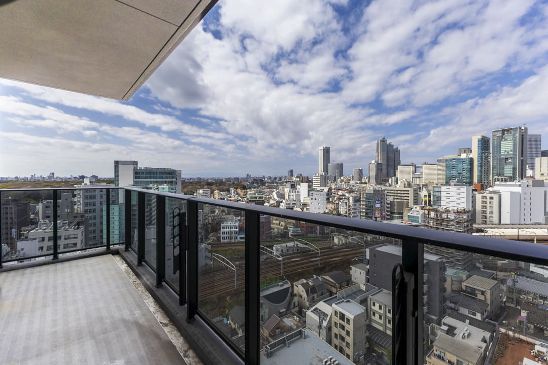 リビングダイニングに面した、北西向きのバルコニー。12.13㎡のゆとりある空間です。最上階の14階部分につき眺望良好。線路の先には都心の街並みが広がり、その奥に明治神宮の豊かな緑を望みます。開放感のある景色のなかで、都市と自然の両方を身近に感じられるロケーションです。