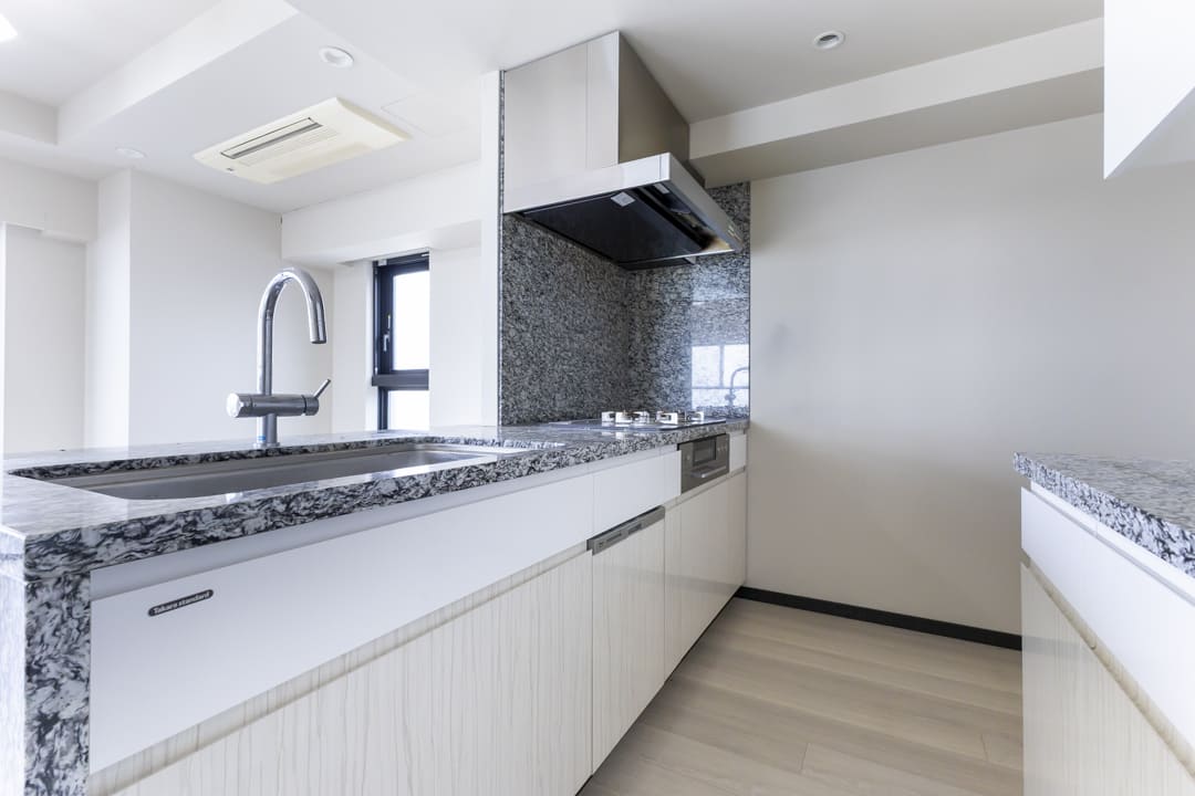 約3.5帖のゆとりあるキッチンスペース。石調カウンターが空間に洗練された印象を添えます。シンク側からはリビングダイニングを見渡すことができ、家族との会話を楽しみながら調理ができるレイアウト。グリル付3口ガスコンロや食洗機を備え、設備も充実しています。