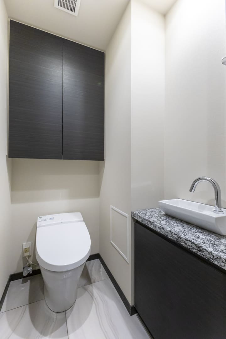 廊下に面していて独立性の高いレストルーム。スタイリッシュなタンクレストイレを採用しています。手洗いカウンター付きのため、ゲストを洗面室へ案内することなくお使いいただける設計です。