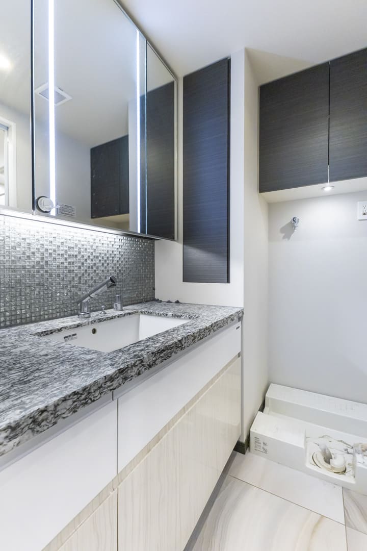石調カウンターが高級感を演出する洗面化粧台。三面鏡にはタテ型の2本の照明が入っていて、顔全体をしっかり照らしてくれます。顔に影ができにくく、お化粧がしやすいですよ。カウンターにはゆとりがあり、化粧品やドライヤーの仮置きが可能。忙しい朝の身支度も落ち着いて行えそうです。