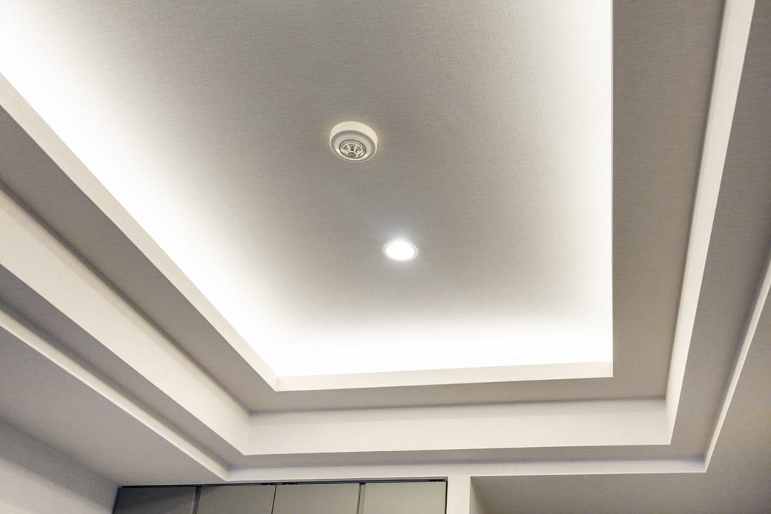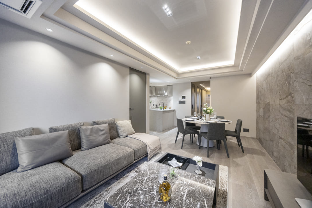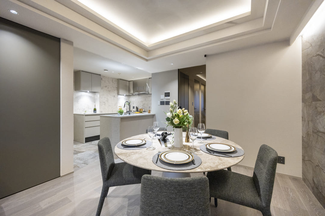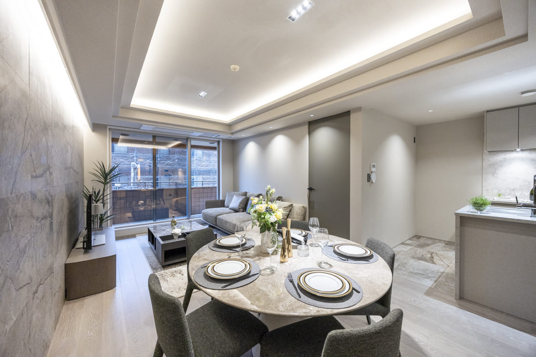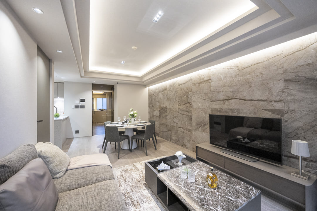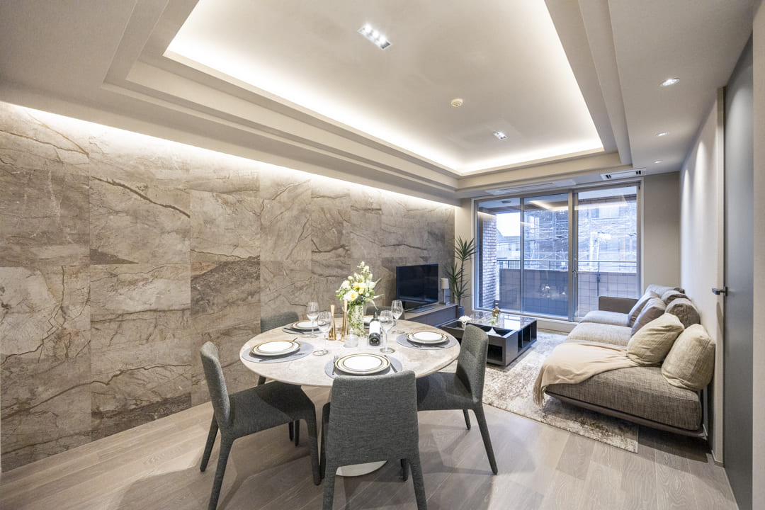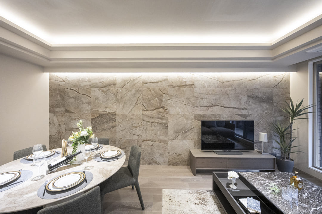 間接照明に照らされた大理石柄のアクセントウォールが、モダンな雰囲気を演出するリビングダイニング。キッチンスペースを含めて約17.0帖のゆとりある空間です。折り上げ天井にも間接照明を配置し、空間に広がりと上品な雰囲気をもたらします。南向きのため、心地よい陽光を感じながら、ゆったりとしたくつろぎの時間をお過ごしいただけます。