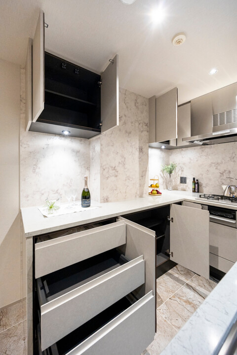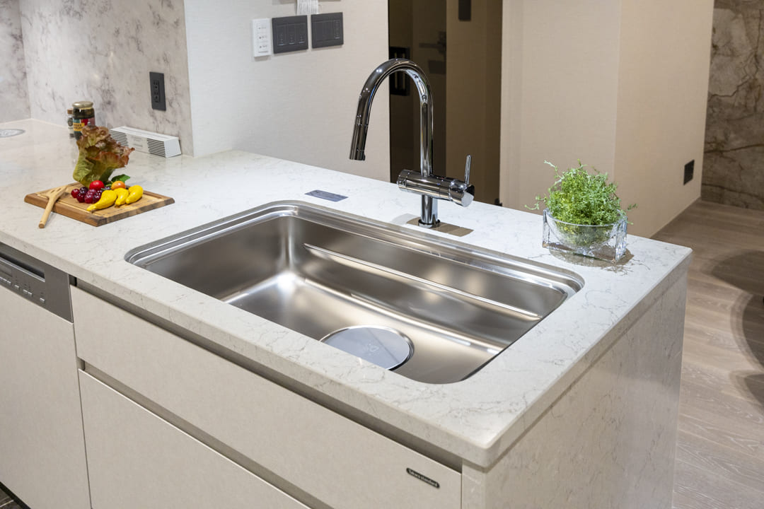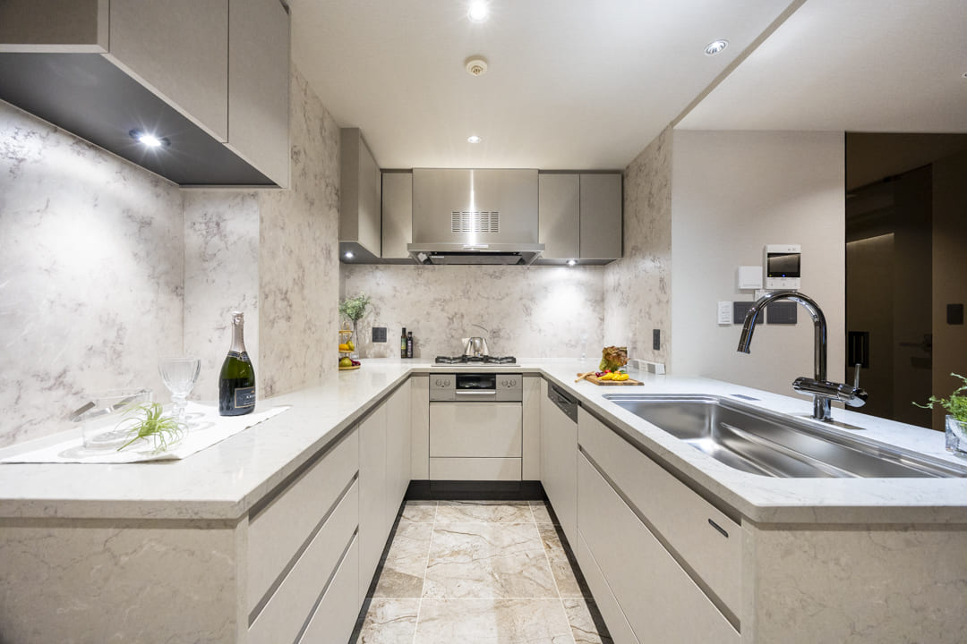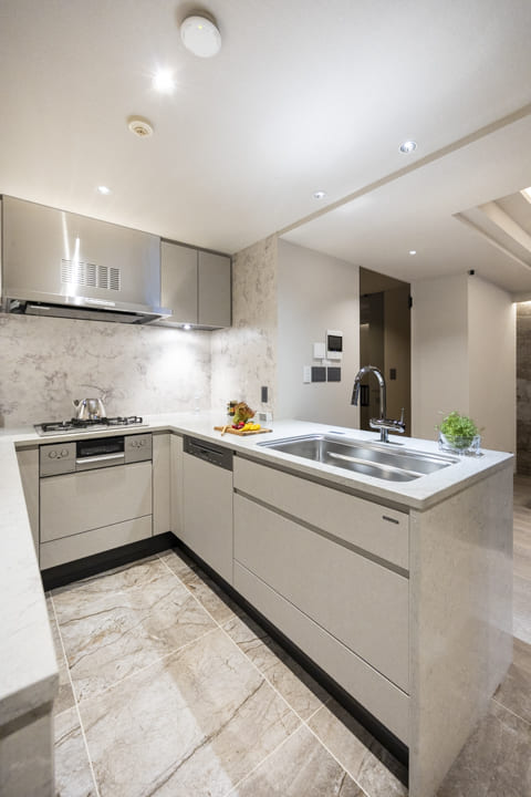 ほどよい独立性を確保した、ゆとりあるキッチン。コの字型カウンターを採用し、広々とした作業スペースが広がります。石柄の壁が空間に上質感を添え、落ち着いた雰囲気に。複数人でも調理がしやすいレイアウトで、料理を通じた家族のコミュニケーションも自然と生まれそうです。足元まで活用した収納も備えられており、調理器具や食材ストックをすっきり整理可能。リビング同様に床暖房が敷設されていて、寒い季節の作業も快適に行うことができます。