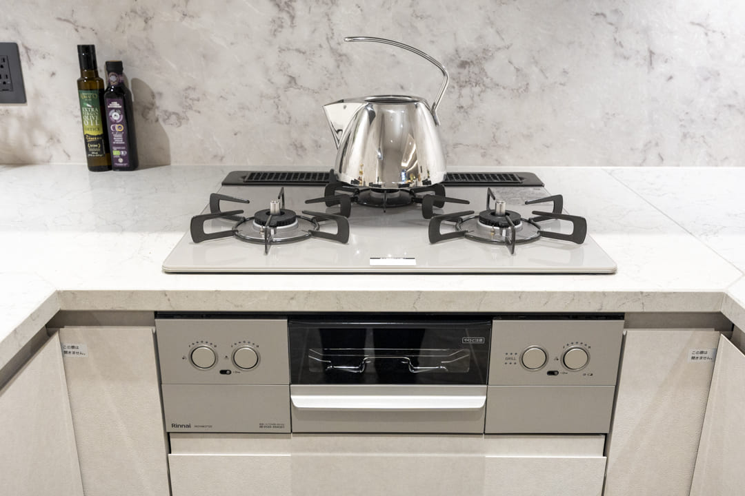 同時調理が叶う、グリル付3口ガスコンロを搭載。さらに、大容量が魅力のMiele(ミーレ)製食洗機を備え、家事効率にも配慮されています。調理から後片付けまでスムーズに進み、快適なキッチン時間をサポートしてくれます。