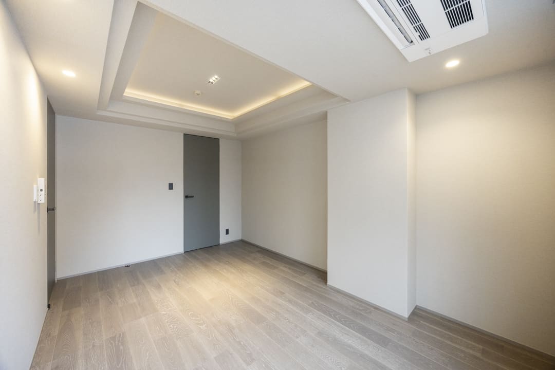 LDKに隣接する約5.6帖の寝室。デザイン性の高い折り上げ天井に間接照明が配され、洗練された雰囲気です。南向きの窓からは心地よい陽光が差し込み、ビルトインエアコンも備えた快適な住空間。4枚折れ戸のクローゼットを設け、収納スペースもしっかり確保されています。