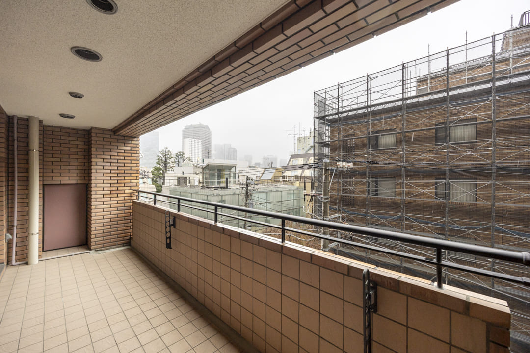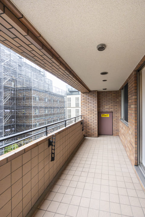 LDKと寝室の両方に面したバルコニー。11.28㎡のゆとりあるスペースです。タイルで統一され、すっきりとした清潔感のある印象。撮影日はあいにくの天候でしたが、南向きのため晴れた日にはあたたかな陽光が心地よく差し込みます。朝の目覚めに軽いストレッチを楽しんだり、日中にほっと一息ついたりと、日常のひとときを穏やかに彩ってくれそうです。