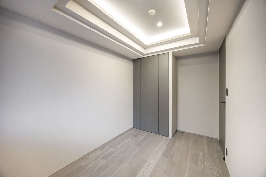 約8.8帖の主寝室。LDKから離れた位置にあり、独立性の高い落ち着いたプライベート空間です。サービスバルコニーに面した二面採光で、やわらかな光が差し込む心地よい室内。折り上げ天井やビルトインエアコンが視線の抜けを生み、空間にさらなる奥行きをもたらします。床暖房も備えており、足元からやさしく暖まる快適性も魅力。インターホン完備で、急な来客時にもリビングまで足を運ぶことなく応対できます。