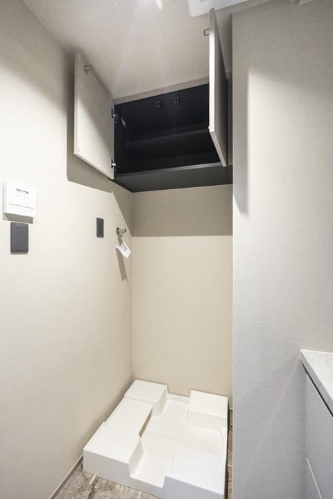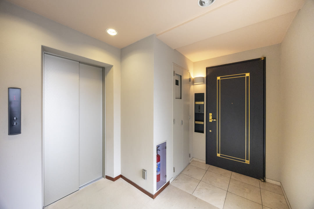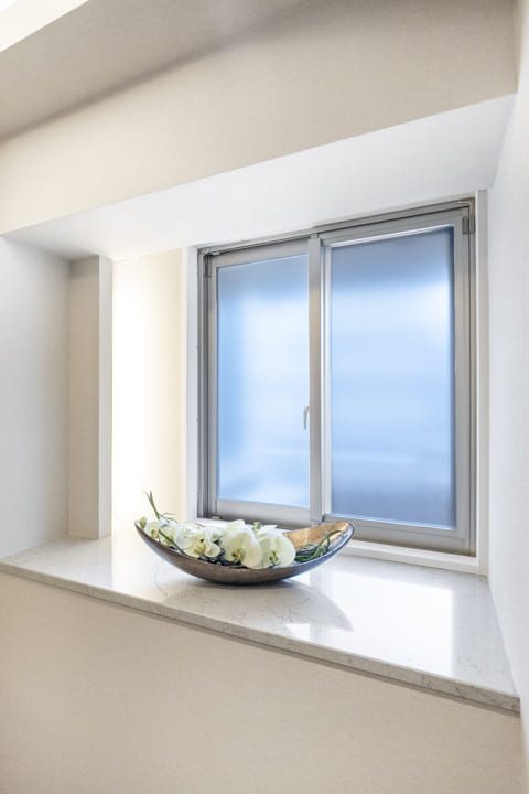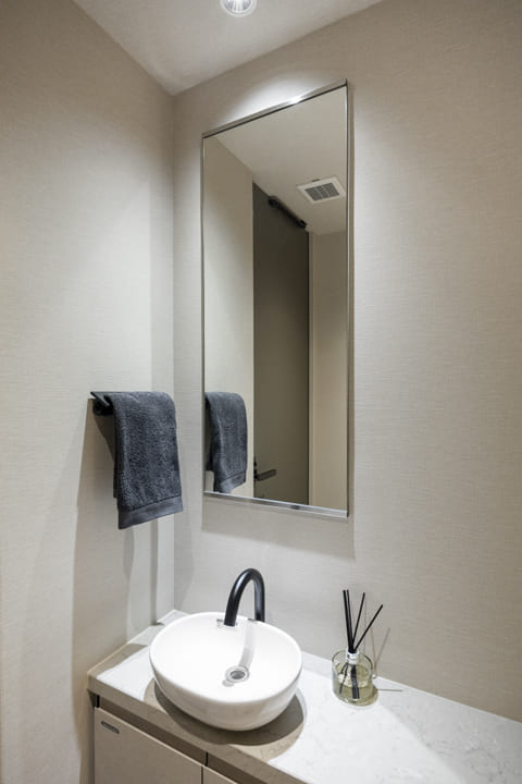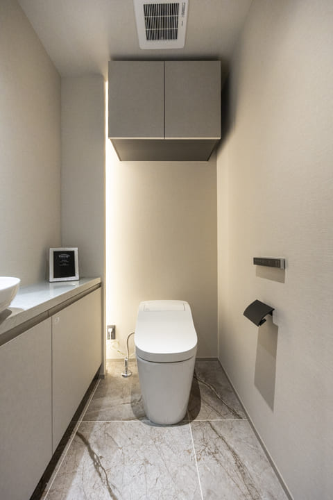 廊下に面していて独立性の高いレストルーム。石柄フロアや間接照明が、洗練された空間を演出します。Panasonic製の洗浄機能付トイレはスタイリッシュなタンクレス仕様。ミラー付きの手洗いカウンターを備え、来客時にもスマートにお使いいただけます。