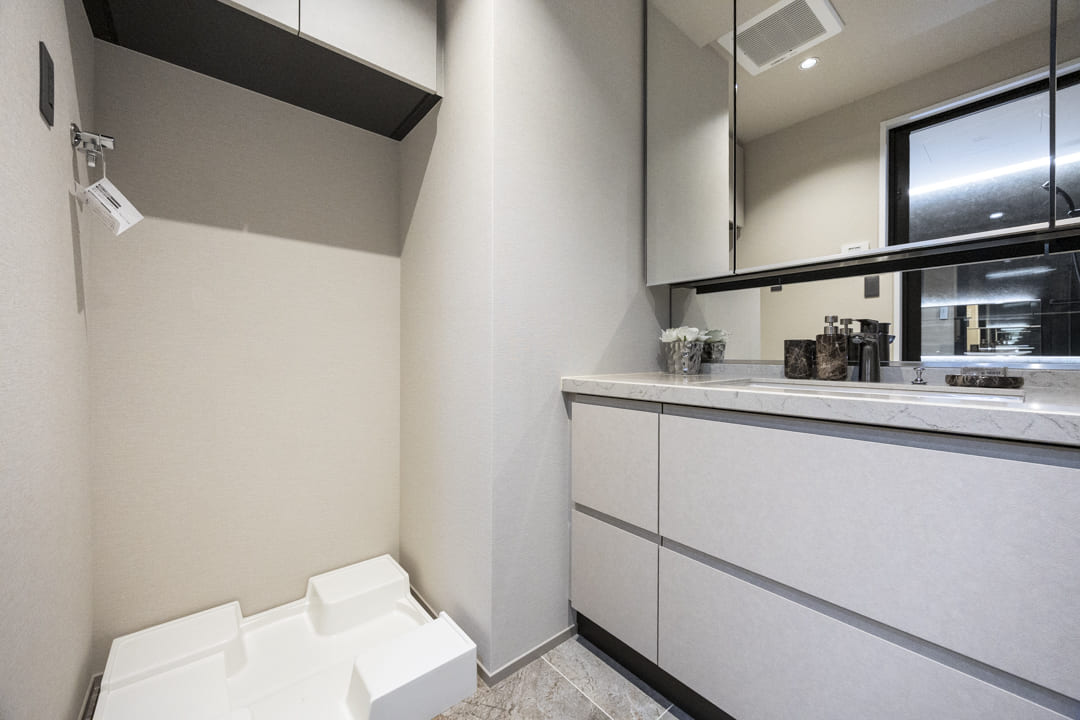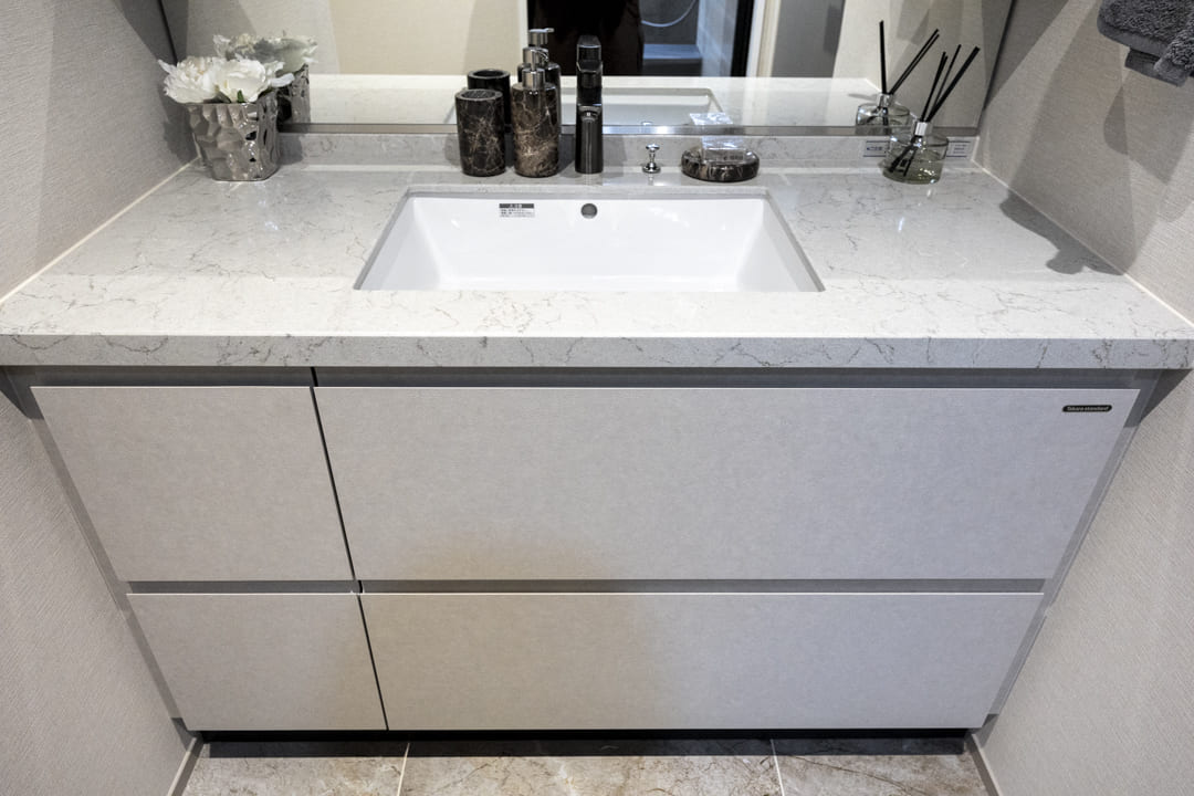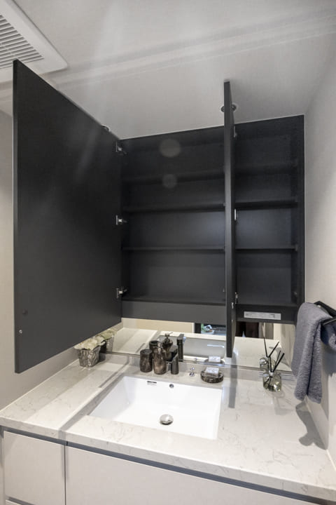 石調カウンターがホテルライクな上質感を演出する洗面化粧台。大きな三面鏡とミドルミラーを備え、ゆとりあるパウダースペースが確保されています。カウンターには化粧品やヘアケア用品をゆったりと並べることができ、落ち着いた気持ちで身支度が整う空間。鏡裏は収納棚になっていて、洗面まわりの小物をすっきり収納可能です。
