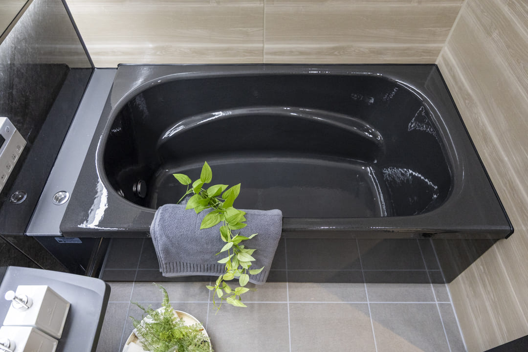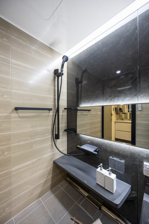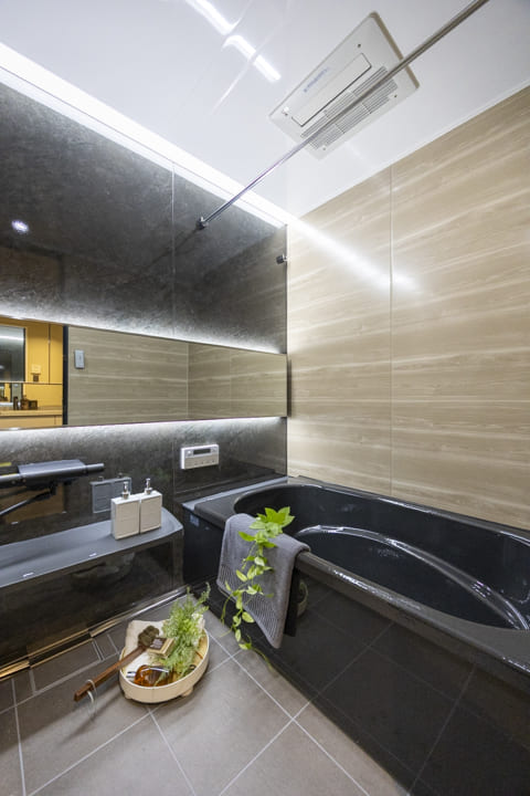 ブラックの浴槽が印象的なバスルーム。フラットに納められたライン照明が、空間をスタイリッシュに照らします。調光・調色機能を備えており、時間帯や気分に合わせて異なる雰囲気のバスタイムを演出。目覚めのシャワーにはすっきりとした昼白色、くつろぎの入浴には暖かみのある電球色と、光の変化もお楽しみいただけます。浴室換気乾燥暖房機や追い焚き機能を備え、設備面も充実しています。