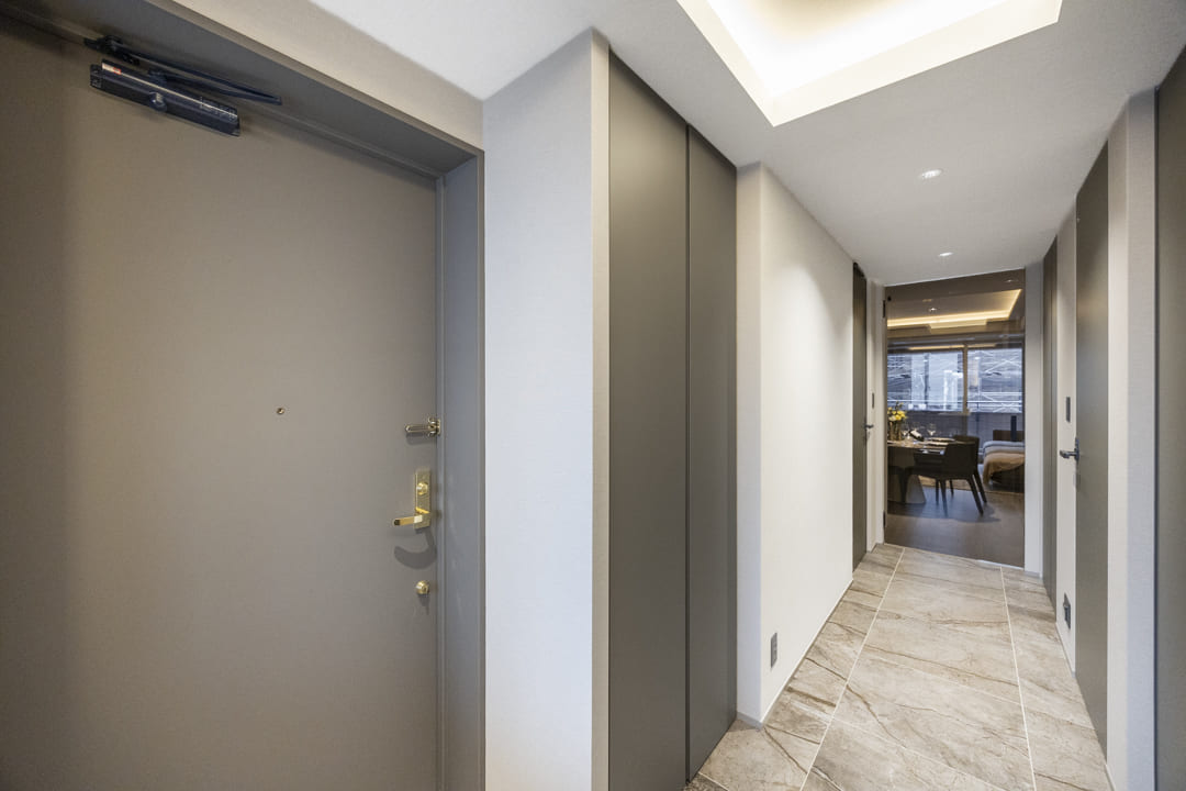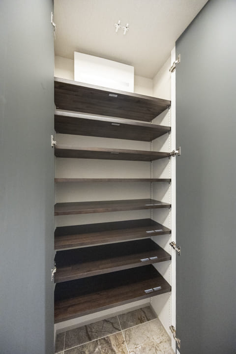 石柄フロアが上質な印象を与える玄関ホール。窓から自然光が差し込み、すっきりとした明るさに包まれます。カウンターには小物やグリーンを飾り、訪れる人を華やかに迎えられそうです。シューズボックスに加え、廊下には可動棚も設けられており、収納力にも配慮されています。