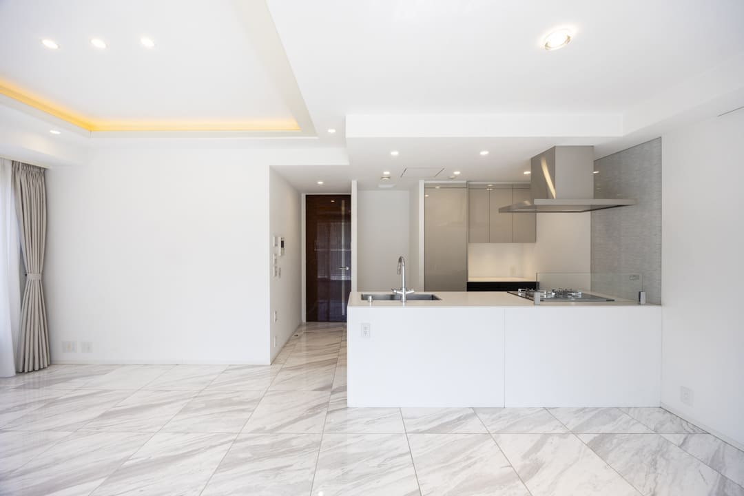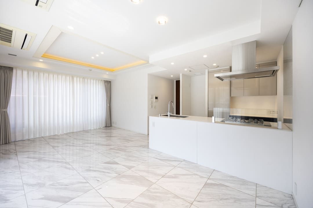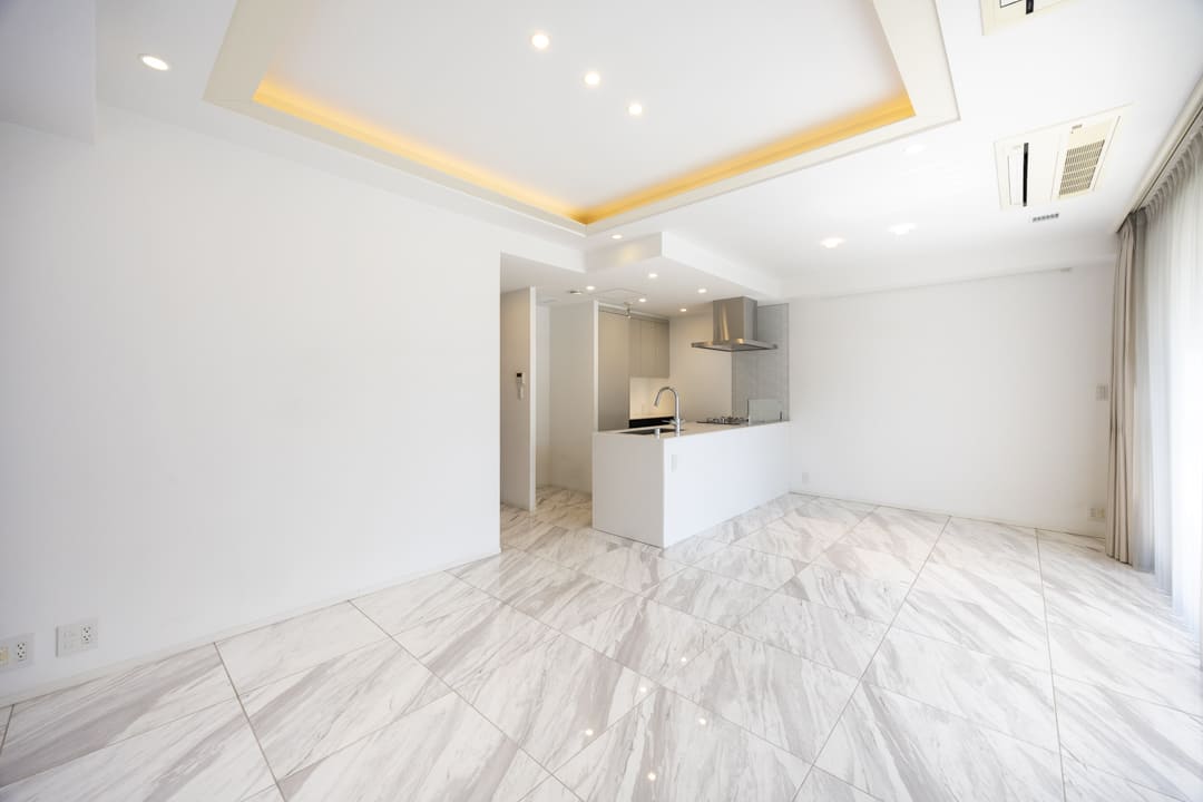 南西二面採光で、明るい光と心地よい風がたっぷり届くリビングダイニング。キッチンスペースを含めて18.3帖の広々とした空間です。バルコニーとフロアを同系色で統一することで、さらに奥行きを感じられる設計。石張りフロアや折り上げ天井、間接照明が上質感を高め、落ち着いた雰囲気が広がります。壁面にはピクチャーレールも備わっており、アートや写真をさりげなく楽しめるのも魅力です。