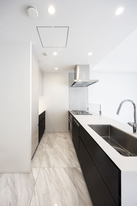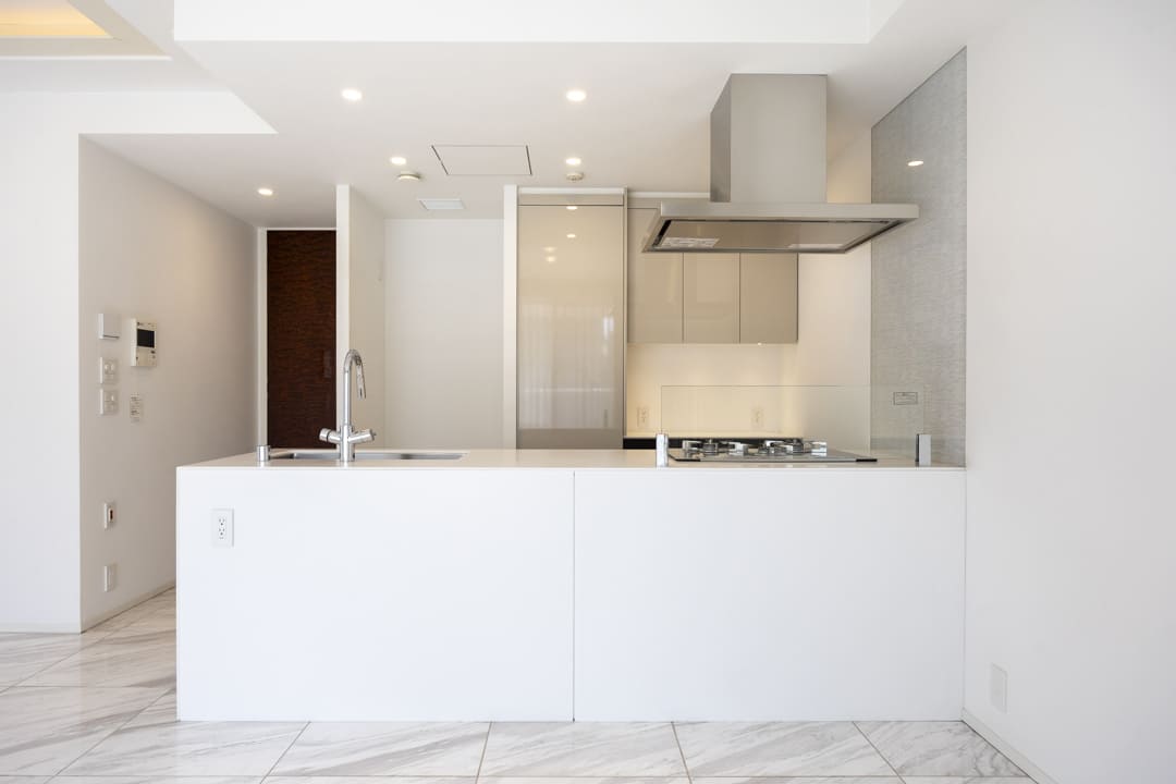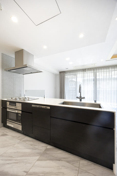 リビングダイニングを見渡せる、開放的な対面キッチン。リビング側はホワイトで統一され、空間に馴染む清潔感のあるデザインです。料理をしながら家族やゲストとの会話を楽しむことができ、心地よい時間を演出。コンロ前にはガラスガードを設けており、リビング側への油はねも心配ありません。