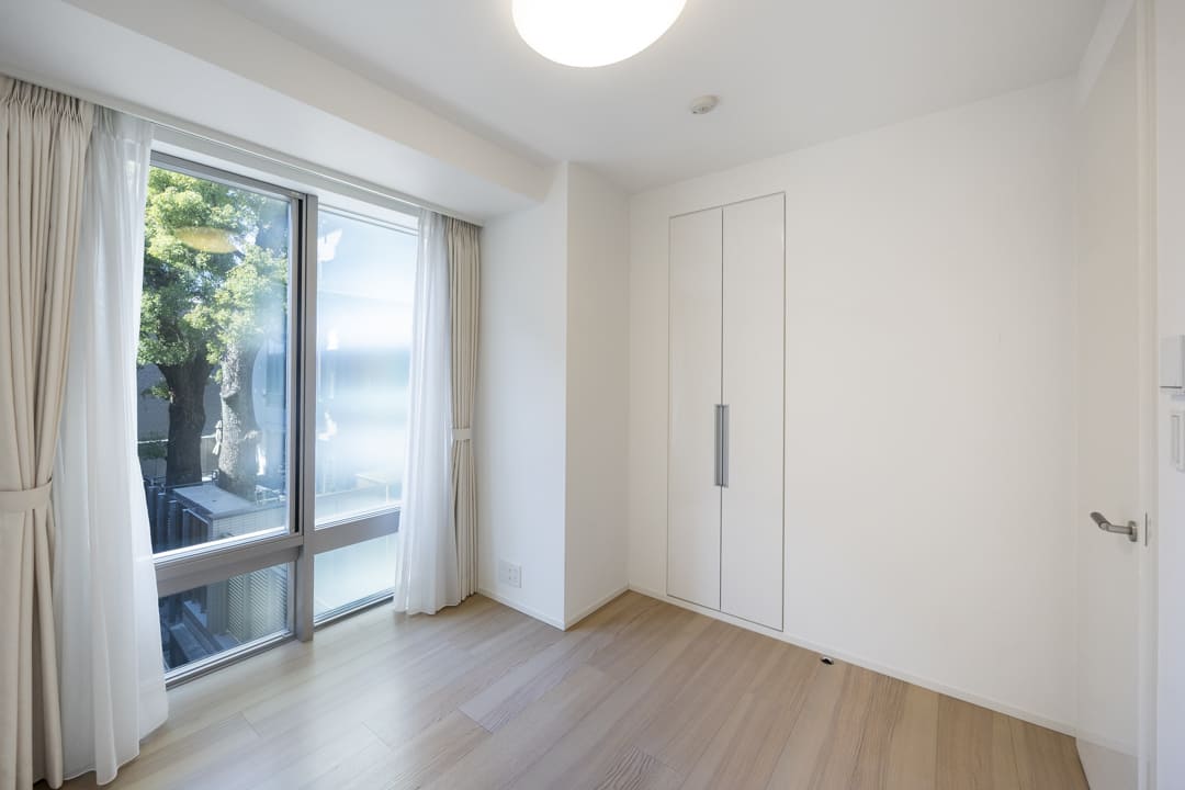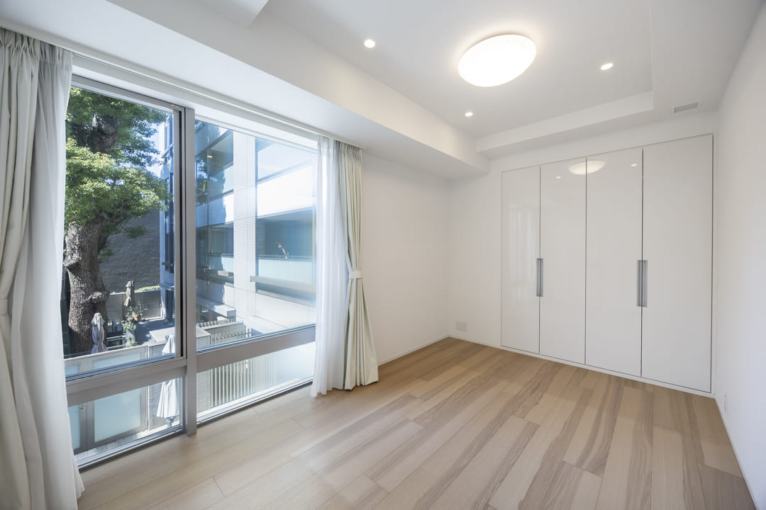 約5.6帖の洋室2。西向きの窓から明るい自然光が差し込み、窓先には木々の緑も望めます。床暖房とクローゼットを備えた、使い勝手の良い一室。寝室としてはもちろん、ワークスペースや趣味のお部屋など多目的にご活用いただけます。