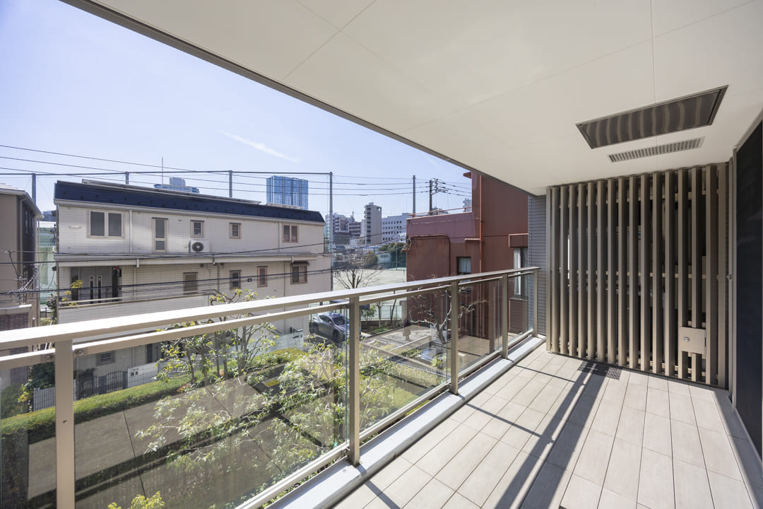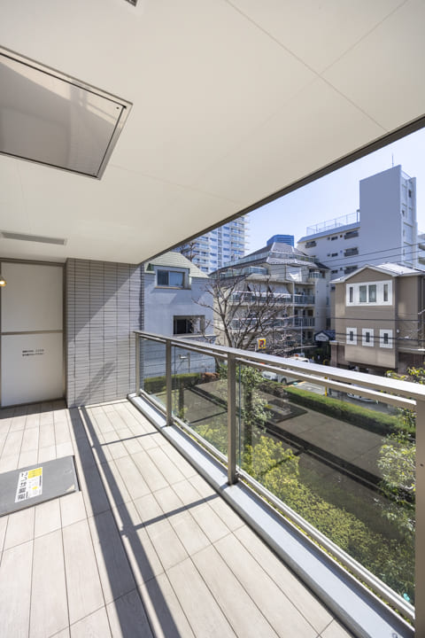 LDKに面したバルコニー。12.79㎡のゆとりある広さです。あたたかな陽光がたっぷりと届く南向きで、心地よい時間が流れます。視線の先には遠く広がる青空、眼下には植栽の緑が見える穏やかな眺めも魅力。朝の目覚めに軽くストレッチを楽しんだり、日中にほっと一息ついたりと、日常のひとときを豊かに彩ってくれます。