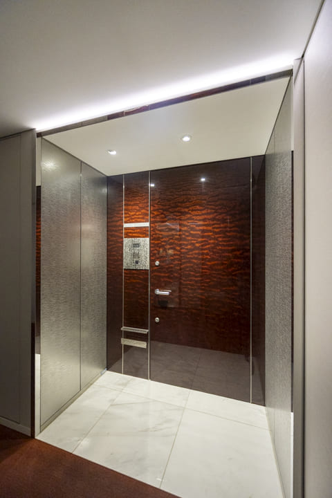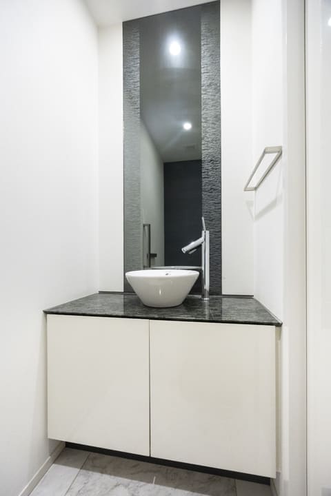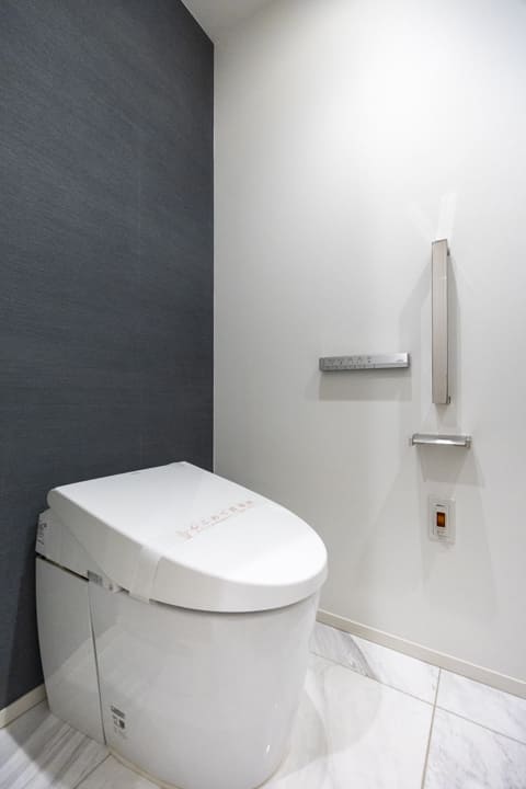 廊下に面し、独立性を確保したレストルーム。ダークグレーのアクセントウォールが上質な空間を演出します。TOTO製の洗浄機能付トイレはタンクレス仕様で、すっきりとした印象。正面には手洗いカウンターを設けており、ゲストを洗面室へ案内することなく、来客時にもスマートに対応できます。