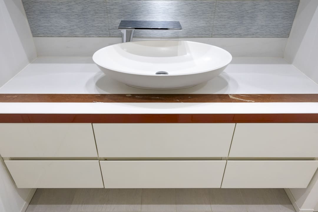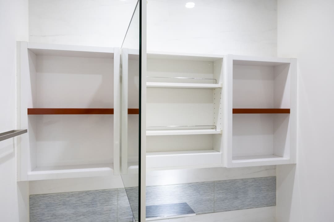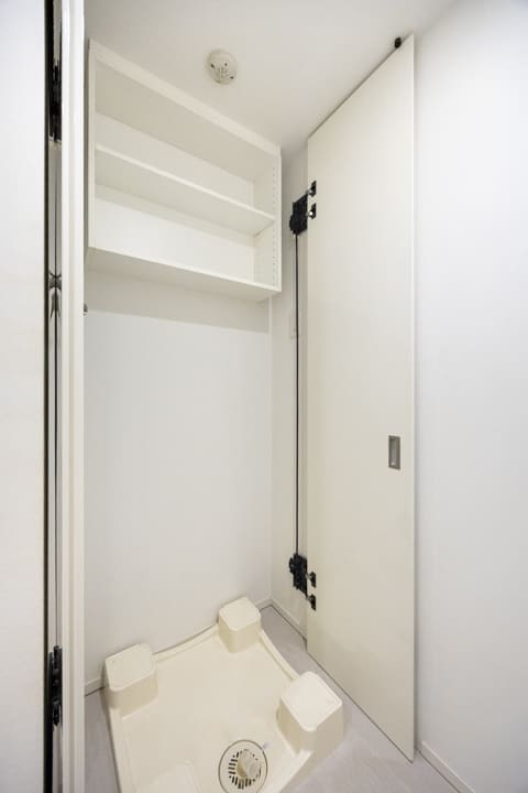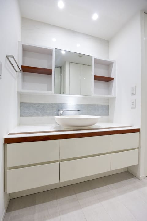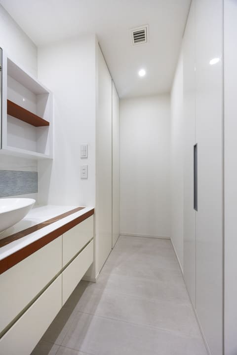 広々としたカウンターと置き型の洗面ボウルを備えた、ホテルライクな洗面化粧台。化粧品やドライヤーを置けるゆとりがあり、忙しい朝の身支度も落ち着いて行えます。鏡横には棚があり、歯ブラシや化粧水など使用頻度の高いアイテムをすっきりと並べておけます。洗面台本体の収納に加え、大容量のリネン庫も備わり、タオルや日用品の整理にも便利。洗濯機置き場は扉付きのため、生活感が出やすい部分をさりげなく隠せるのも嬉しいポイントです。