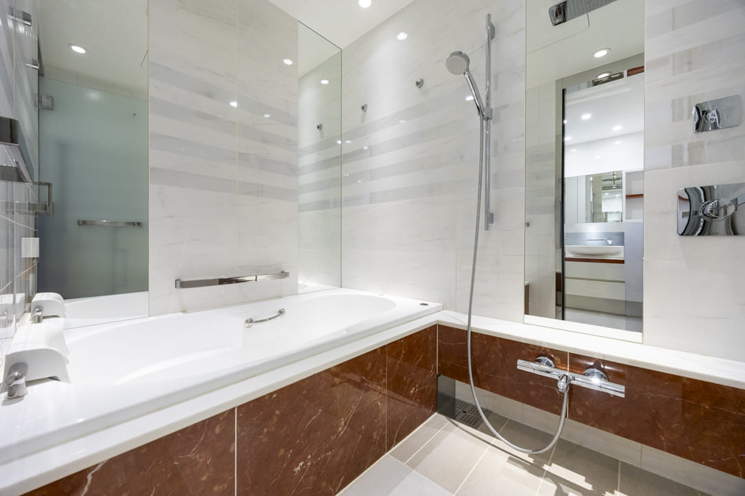 ゆったり入浴できる1620サイズのバスルーム。洗い場だけでなく浴槽側にもミラーを配置し、広がりと上質感を感じる空間です。浴槽にはヘッドレストとステップが備わり、ゆったりと身体を預けて寛げる設計。換気乾燥暖房機・追い焚き機能を搭載し、季節を問わず快適なバスタイムをお楽しみいただけます。シャワーは2種類設けられており、用途に応じて使い分けが可能。全身を包み込むようにお湯を浴びられるオーバーヘッドシャワーには、優れた保温効果が期待できます。