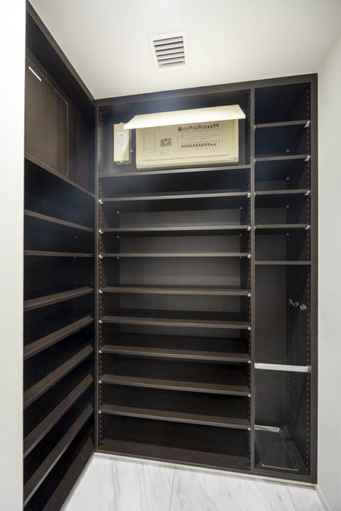 石張りで高級感の漂う玄関ホール。人感センサー付照明を備え、夜の帰宅時も明るく出迎えてくれます。荷物で両手が塞がっている時でもスイッチを探す手間がなく、スムーズに出入りできます。約1.5帖のSIC(シューズインクローゼット)を設け、収納も充実。ロングブーツや雨具などもすっきりと収まり、清潔感のある玄関を保つことができます。