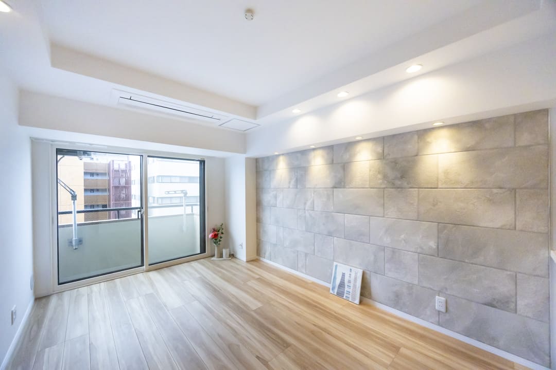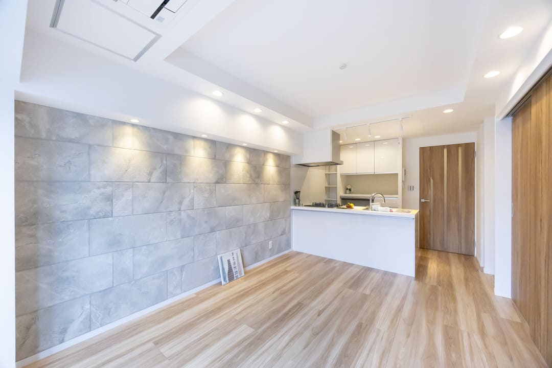 石目調のアクセントクロスやダウンライトの優し気な光で、上質な雰囲気を演出してくれています。さらに、エアコンは埋め込み式のため、すっきりとした印象に。