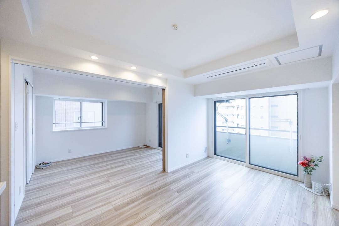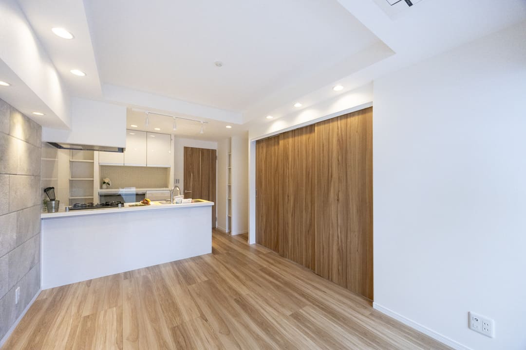 約11.0帖のリビングダイニングキッチンです。洋室1との引戸を開けることにより、二部屋を繋げて使うことができるので、より開放的な空間に。また、南西向きのため日当たりが良好で、窓は二重サッシになっており、防音・断熱効果が期待できます。