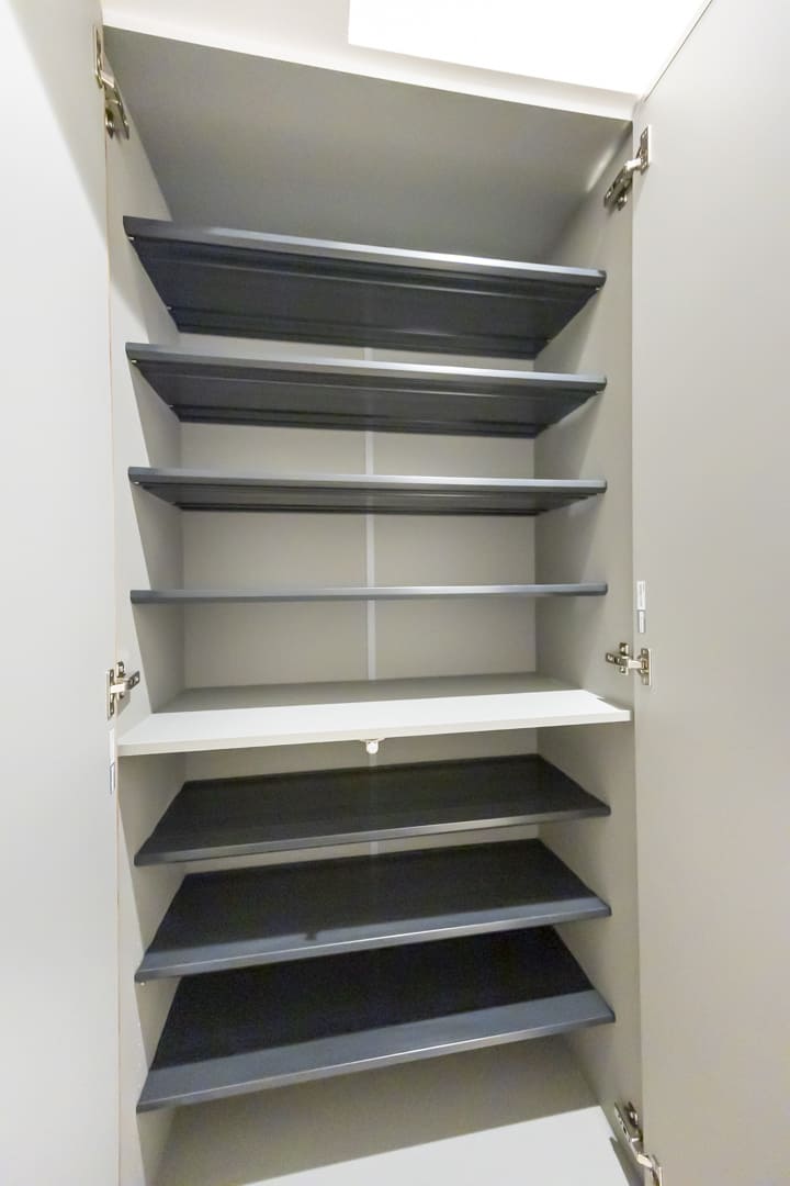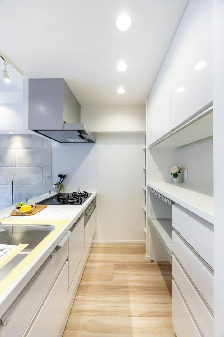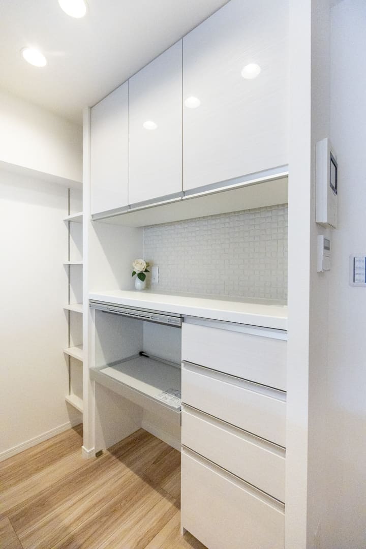 キッチンの背面側にはカップボードが備え付けられています。調味料や食器などを収納できるだけでなく、電子レンジなどを置くこともできるので便利です。さらに、カップボードや冷蔵庫置場の横には可動棚が設置されています。