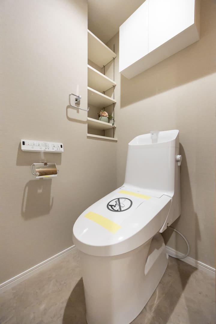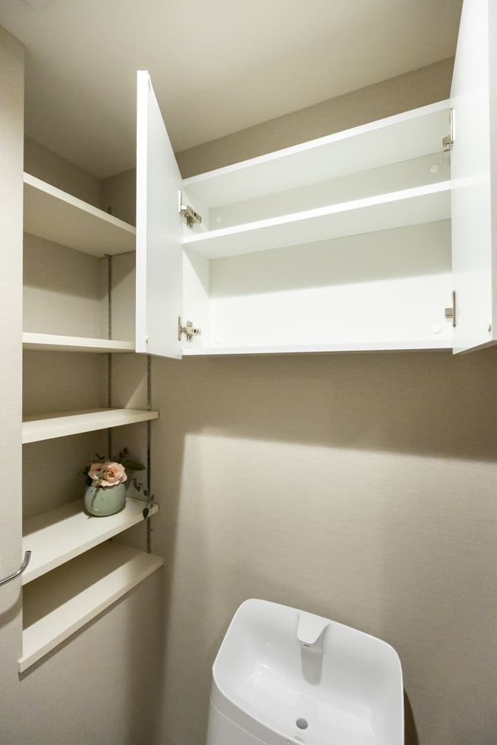 ウォシュレット一体型トイレです。吊戸棚には、トイレットペーパーや掃除用具などを収納できたり、可動棚には小物やアロマを飾ったりすることができます。