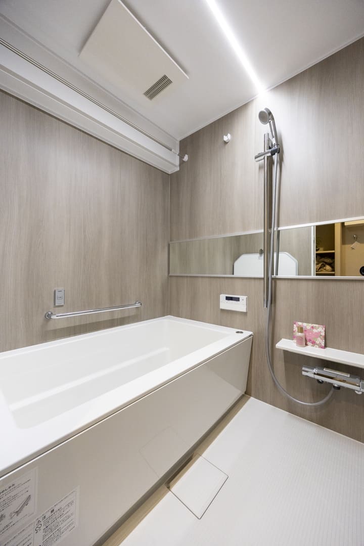 ブラウンの壁パネルが落ち着いた雰囲気を演出してくれている浴室です。お風呂にゆっくり浸かるのが好きという方に嬉しい追い焚き機能を搭載。家族の入浴時間がずれてしまっても安心です。浴室乾燥機には暖房・乾燥・換気・涼風の機能がついており、一年中快適に過ごすことができます。また、照明は2種類をスイッチ一つで切り替えられるので、その日の気分に合わせて浴室の雰囲気を変えることができます。