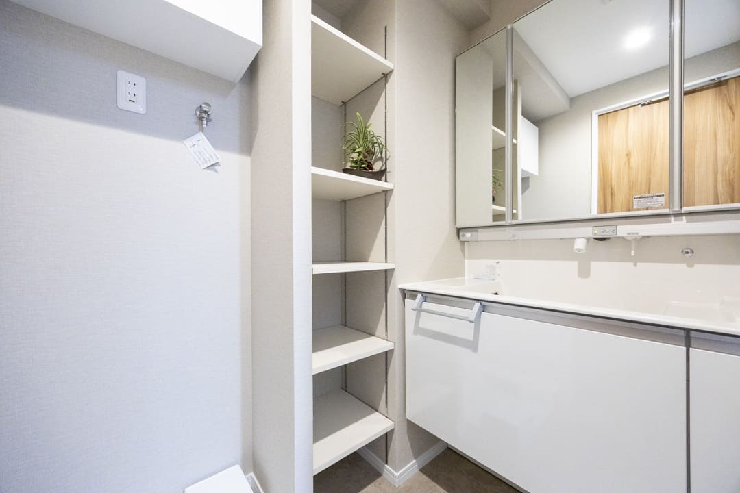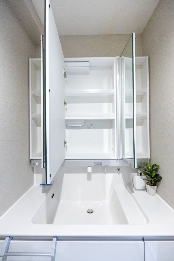 三面鏡の中に化粧品などを収納できて使い勝手良好な洗面化粧台です。照明が縦に配置されているので、顔に影をつくらないのも◎。カウンターと洗面ボウルには継ぎ目がないため、お手入れも簡単です。水栓が下向きに設置されていて、水が溜まりにくくなっているのも嬉しいポイント。また、横には可動棚が造られており、リネン類もすっきりと収納可能です。