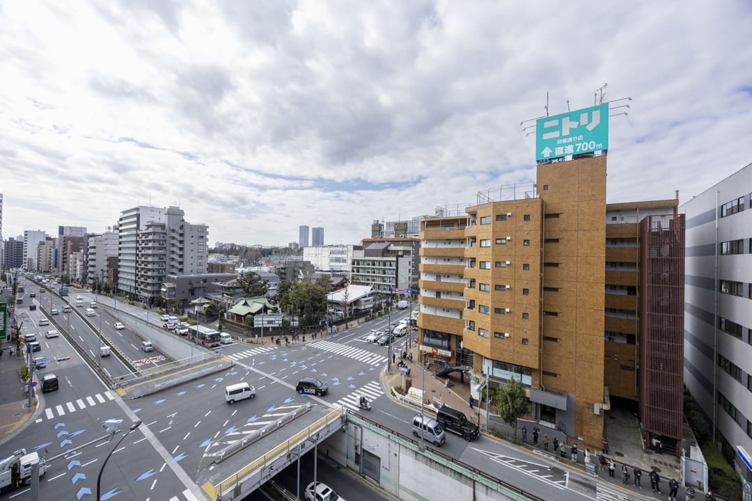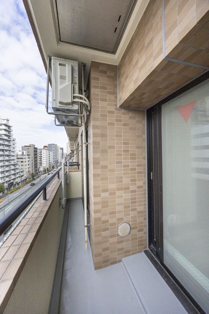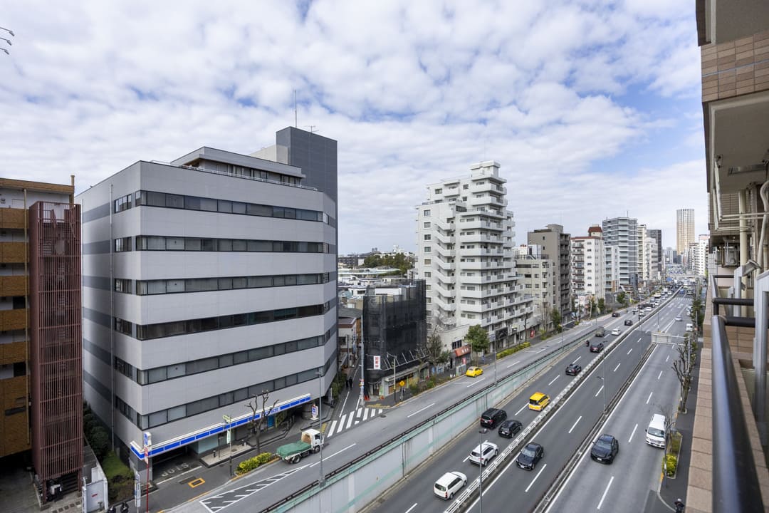 約4.95㎡のバルコニーは南西向きのため日当たりが良好です。目の前は山手通りのため、建物が隣接しておらず、抜け感のある眺望となっています。また、洗濯金物が設置されているので、洗濯物も干しやすそうです。