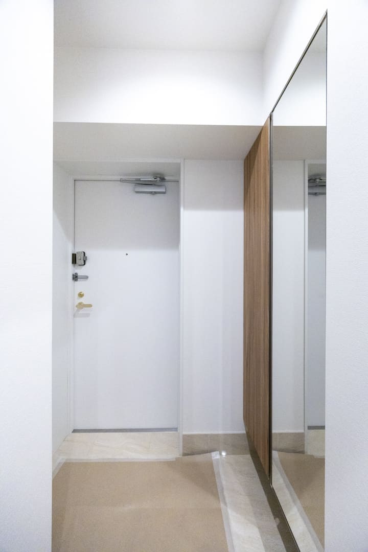 玄関入って左側にはシューズボックスが備え付けられています。フロートタイプのため、空間に圧迫感を与えません。さらに、扉面には鏡が設置されているので、出かける際に全身のコーディネートをチェックすることができます。