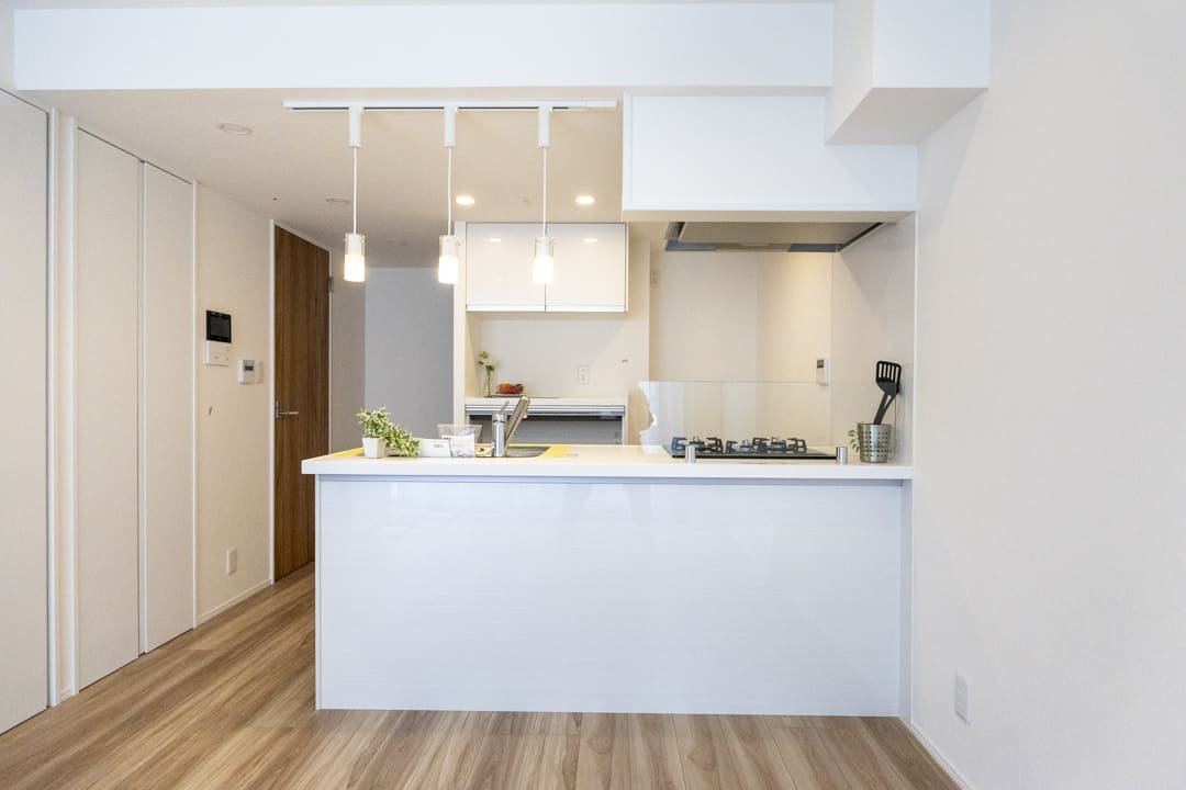 キッチンは、リビングダイニングを見渡しながら料理ができる対面式です。来客とのコミュニケーションが取りやすくて◎。