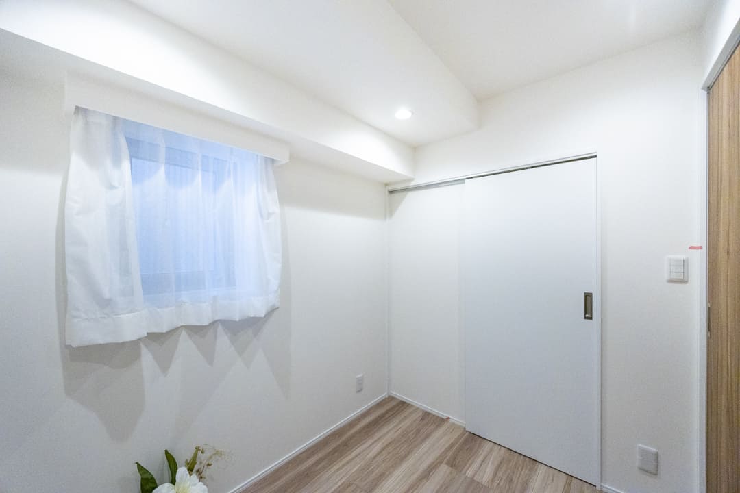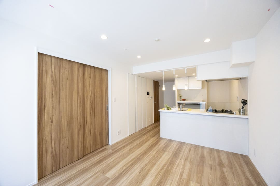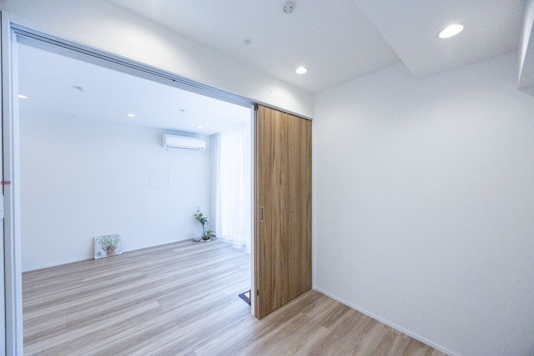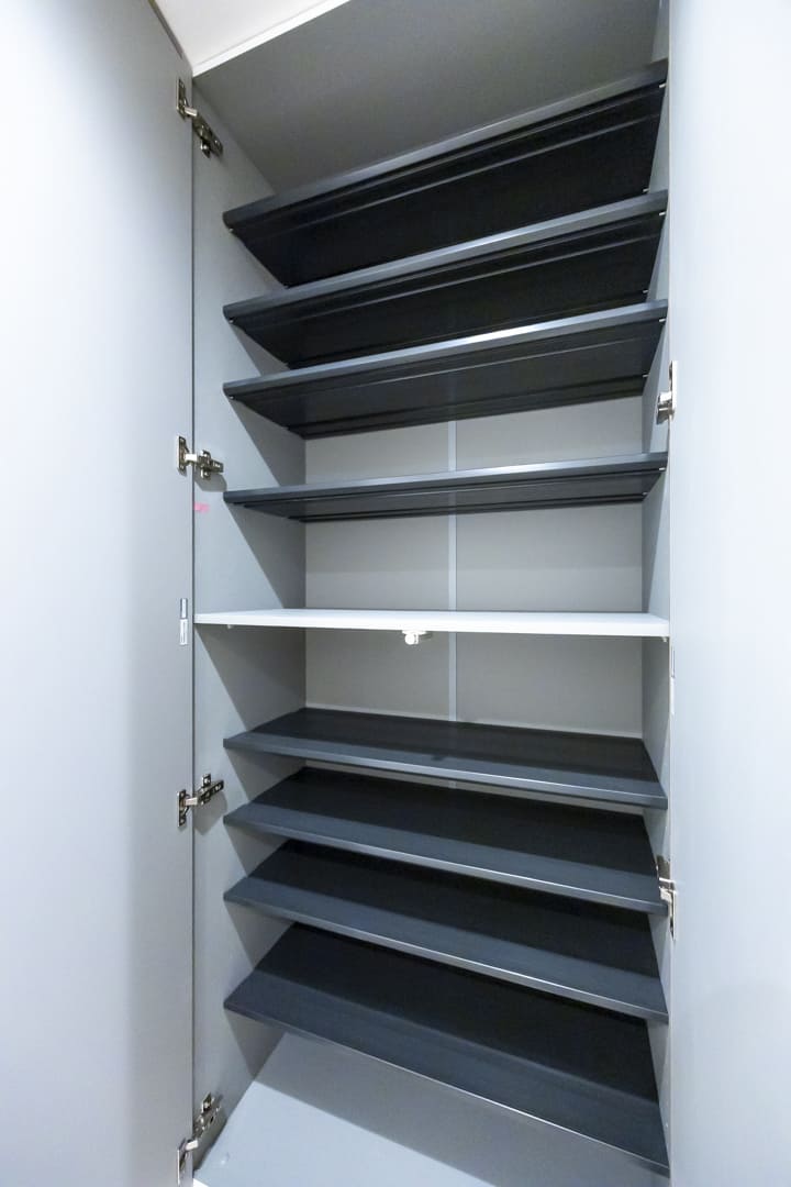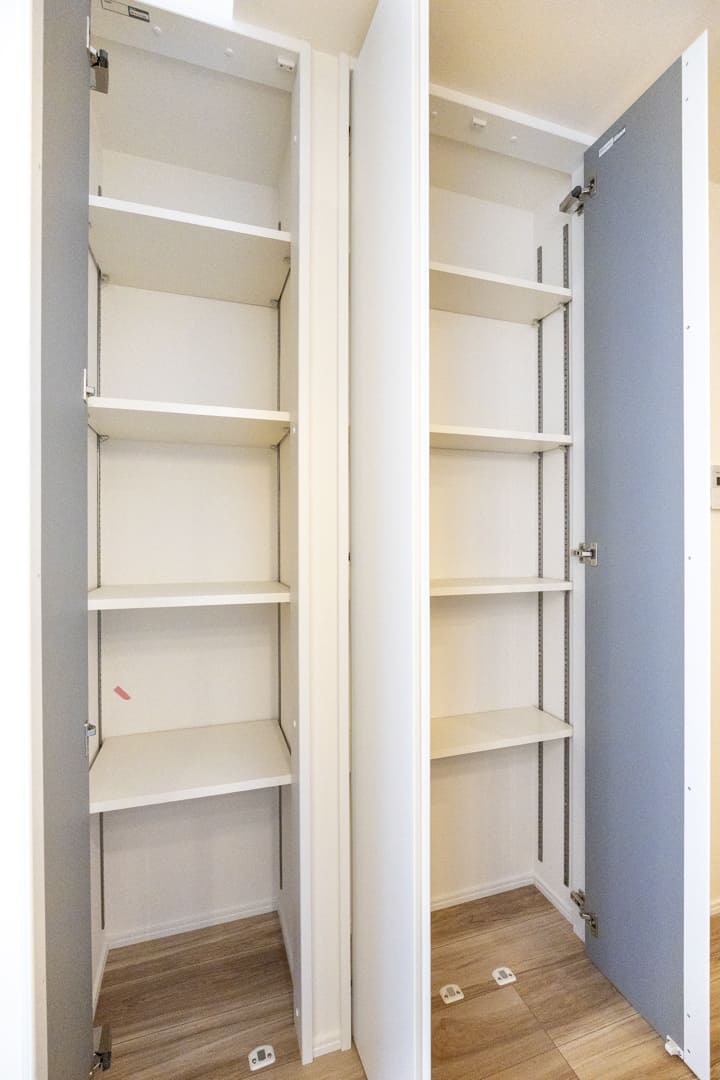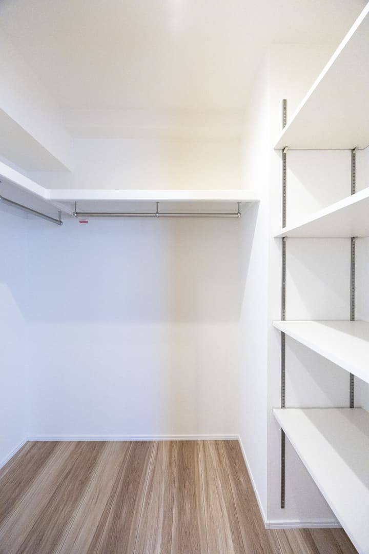 リビングダイニングキッチンに隣接する洋室には、奥行きがあるウォークインクローゼットが造られています。中にはパイプハンガーや可動棚が設置されており、色々な物を収納することができます。引戸を開閉することによって、空間をフレキシブルに使うことができて便利です。