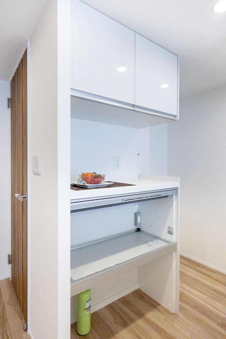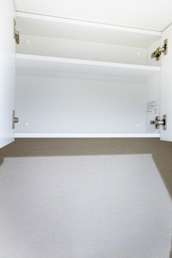 キッチンの背面側にはカップボードが備え付けられています。調味料や食器などを収納できるだけでなく、電子レンジなどを置くこともできるので便利です。