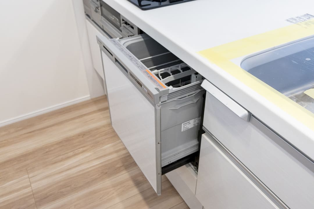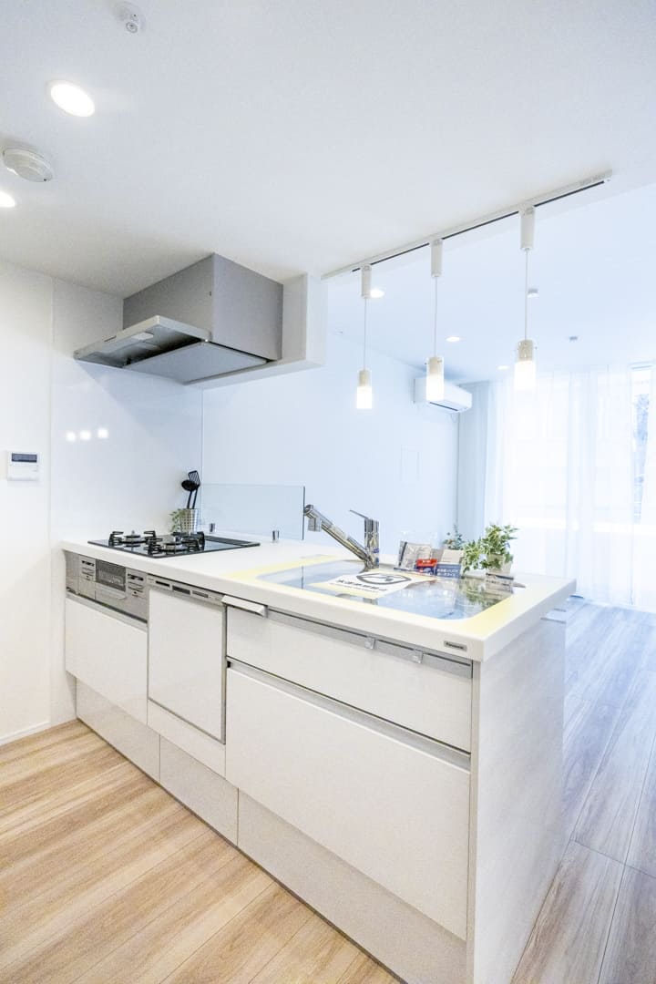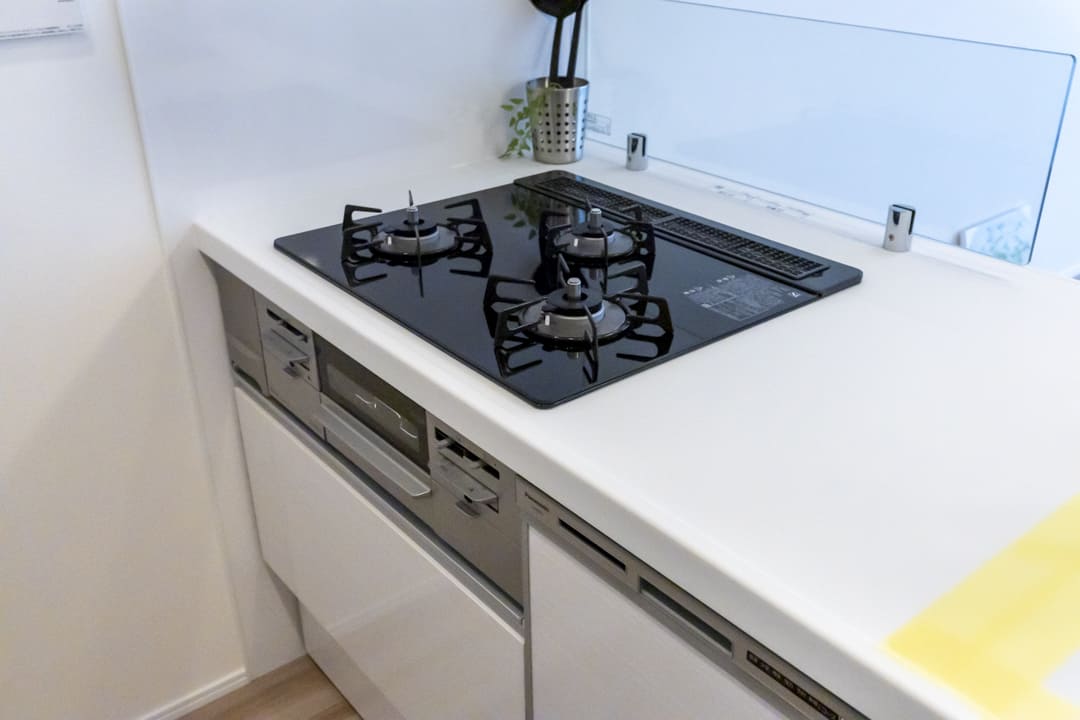 3口コンロ、グリル、食洗機付きと設備面も充実しています。シンクも広々としているので野菜などが洗いやすそうですよ。