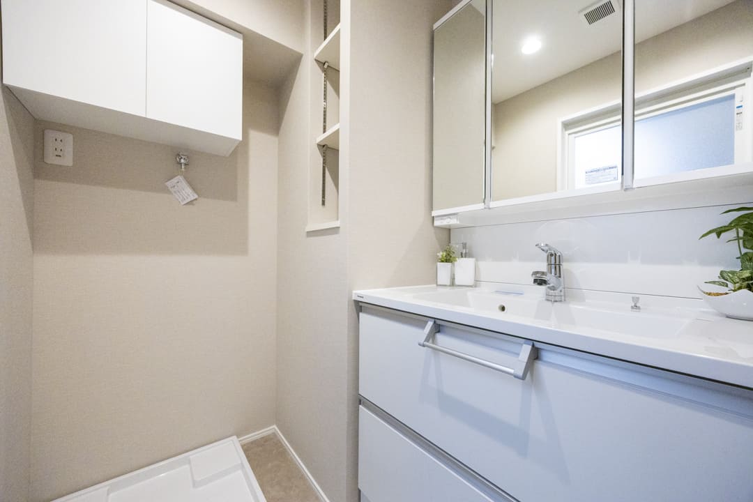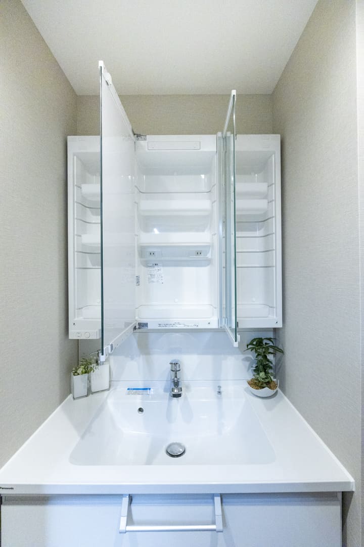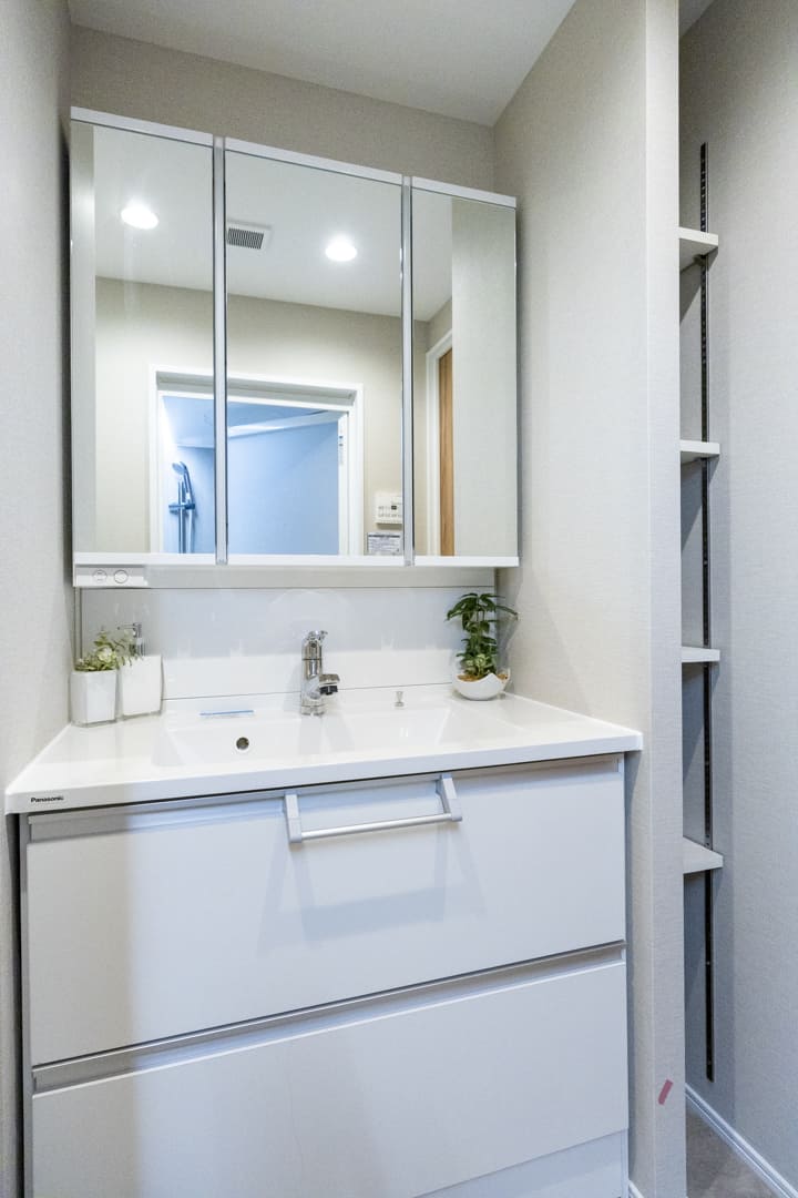 Panasonic製の洗面化粧台は、三面鏡の中に化粧品などを収納できて使い勝手が良好。照明は縦に配置されているので、顔に影をつくらないのも◎。洗面ボウルとカウンターには継ぎ目がないため、お手入れも簡単です。横には可動棚も設置されています。
