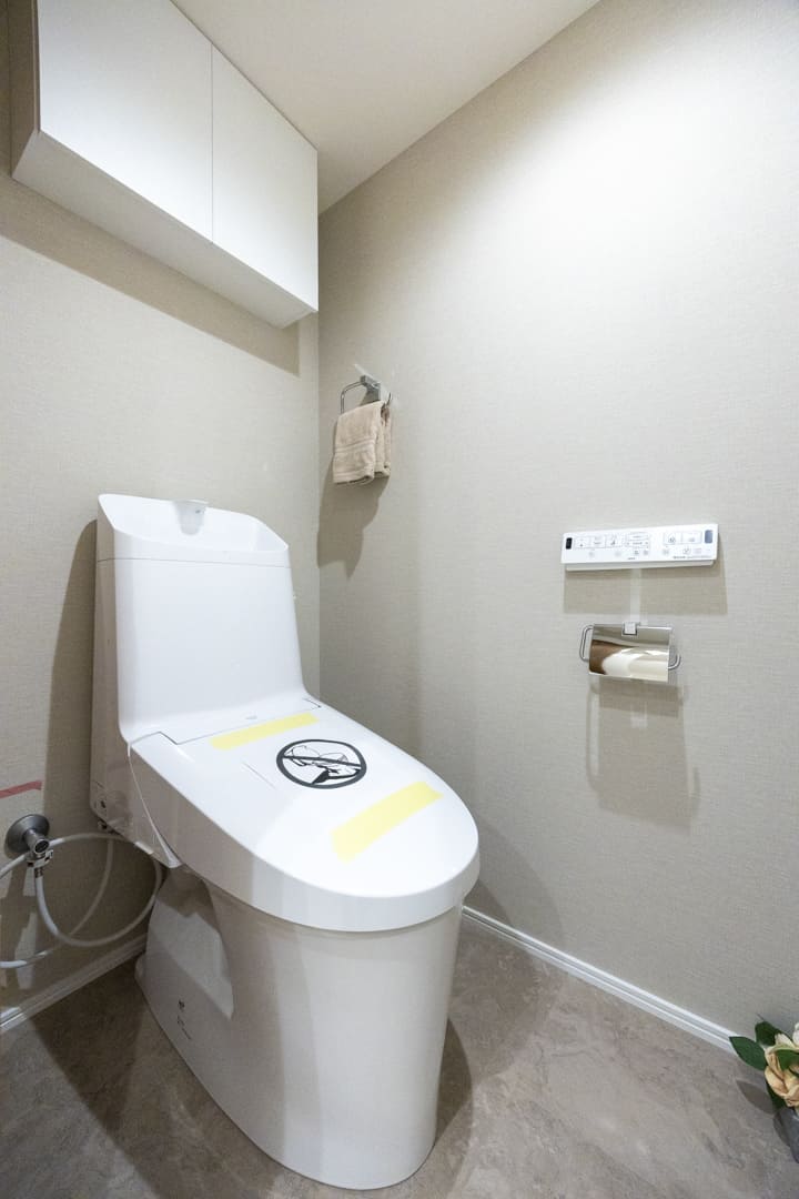 ウォシュレット一体型トイレです。上部には吊戸棚が設置されているので、トイレットペーパーや掃除用具などを収納することができます。