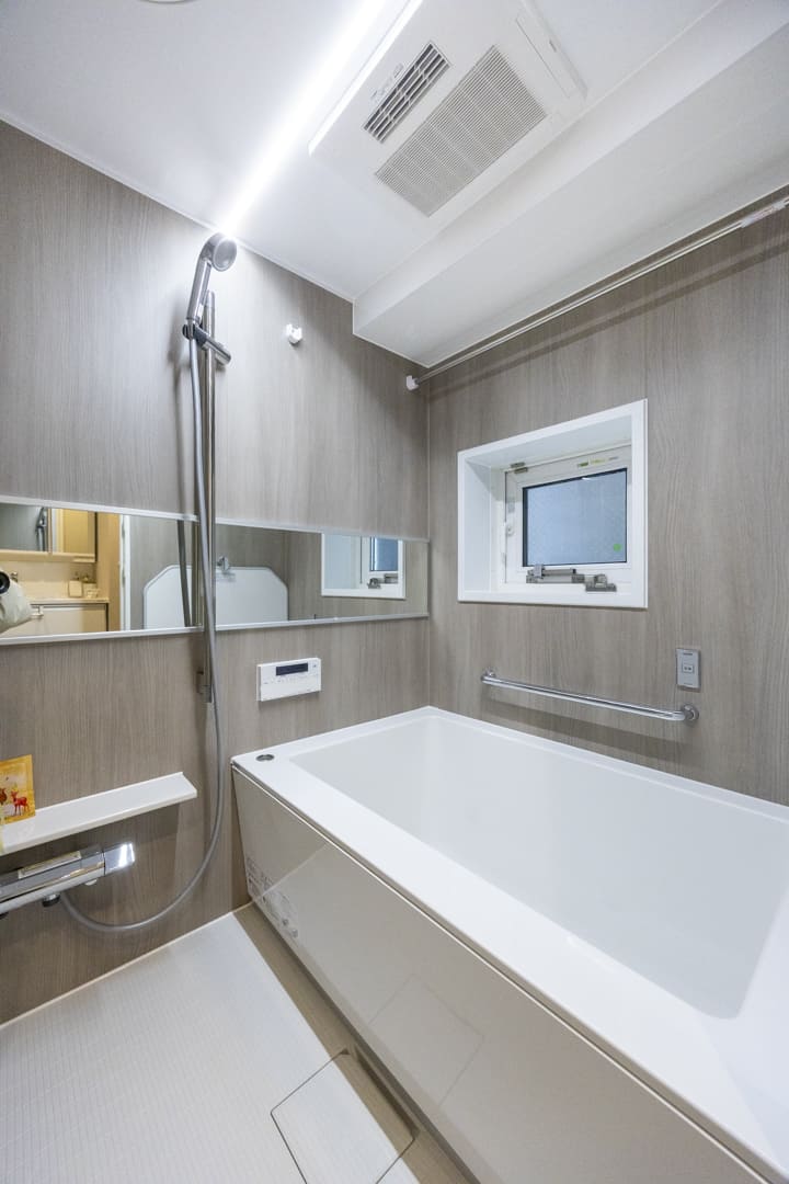 ブラウンの壁パネルが落ち着いた雰囲気を演出してくれている浴室です。お風呂にゆっくり浸かるのが好きという方に嬉しい追い焚き機能を搭載。浴室乾燥機には暖房・乾燥・換気・涼風の機能がついており、一年中快適に過ごすことができます。また、照明は2種類をスイッチ一つで切り替えられるので、その日の気分に合わせて浴室の雰囲気を変えることができます。
