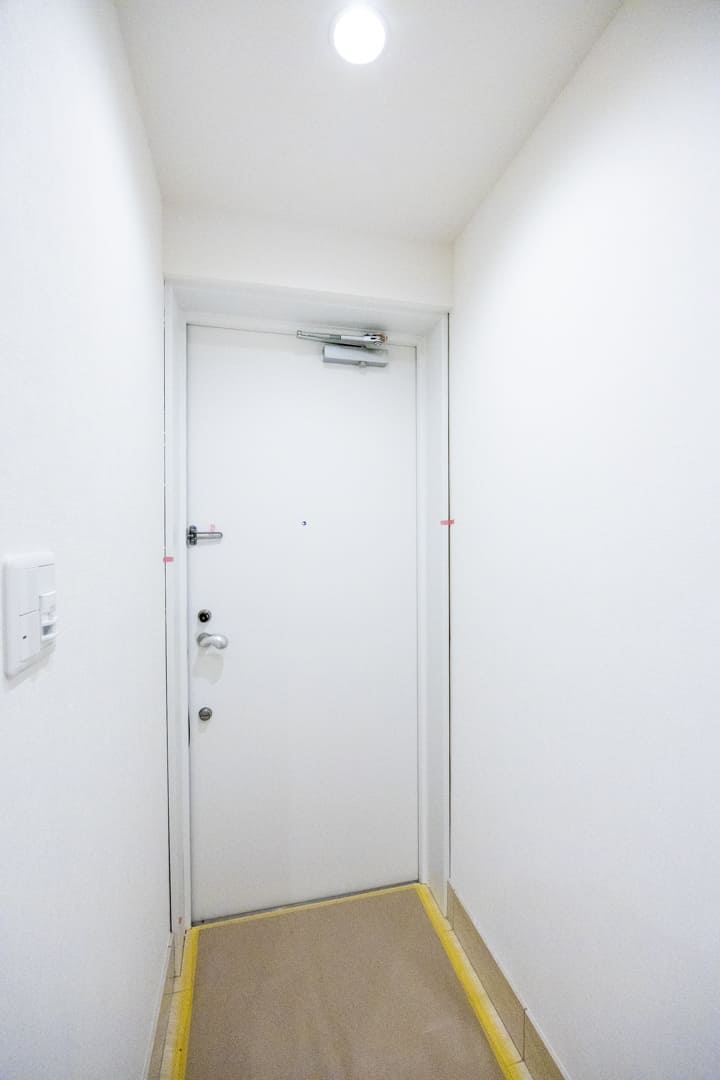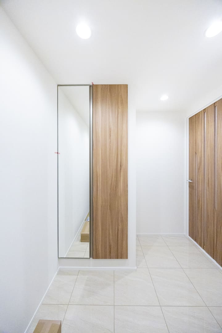 白を基調とした清潔感のある玄関です。入って正面にはシューズボックスが備え付けられています。扉面には鏡が設置されているので、出かける際に全身のコーディネートをチェックすることができます。