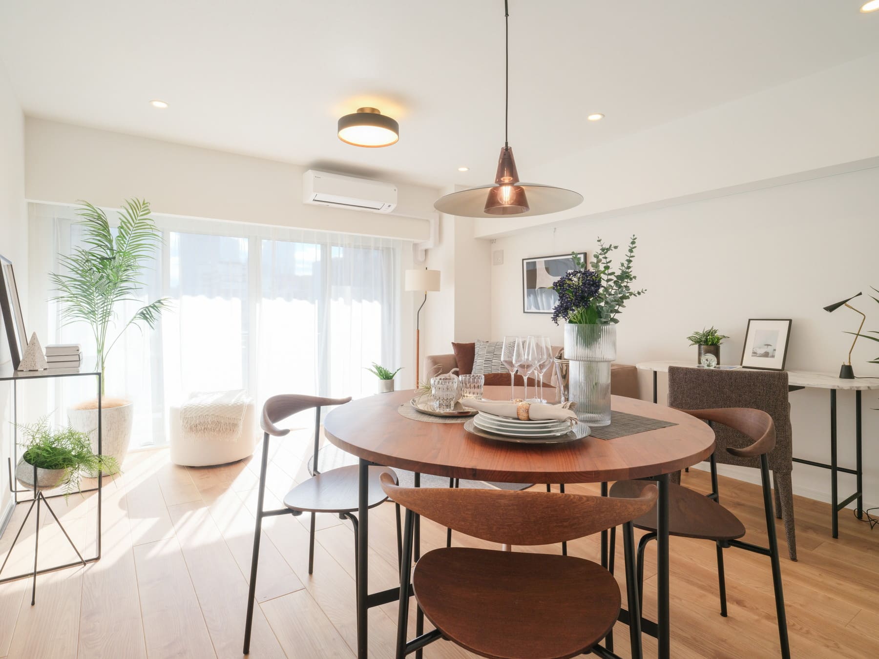 約12.2帖のリビングダイニングは、南東向きのため日当たりが良好です。壁面にはピクチャーレールが設置されているので、壁を傷つけずに絵画やグリーンなどを飾ることができます。