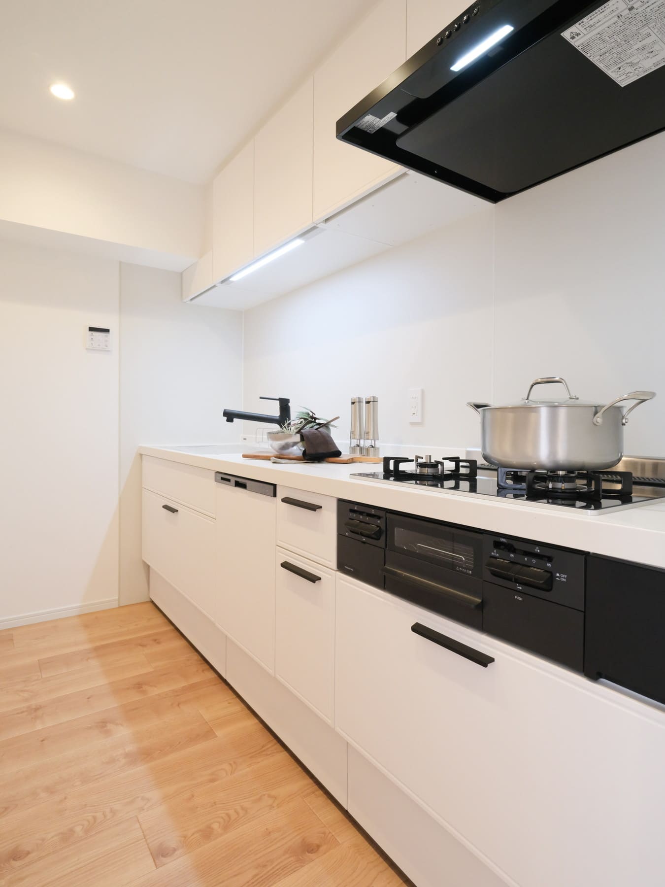 キッチンは、生活感が出やすいキッチンまわりをさりげなく目隠しすることができる独立キッチンです。また、3口コンロ、グリル、食洗機付きと設備面も充実しています。