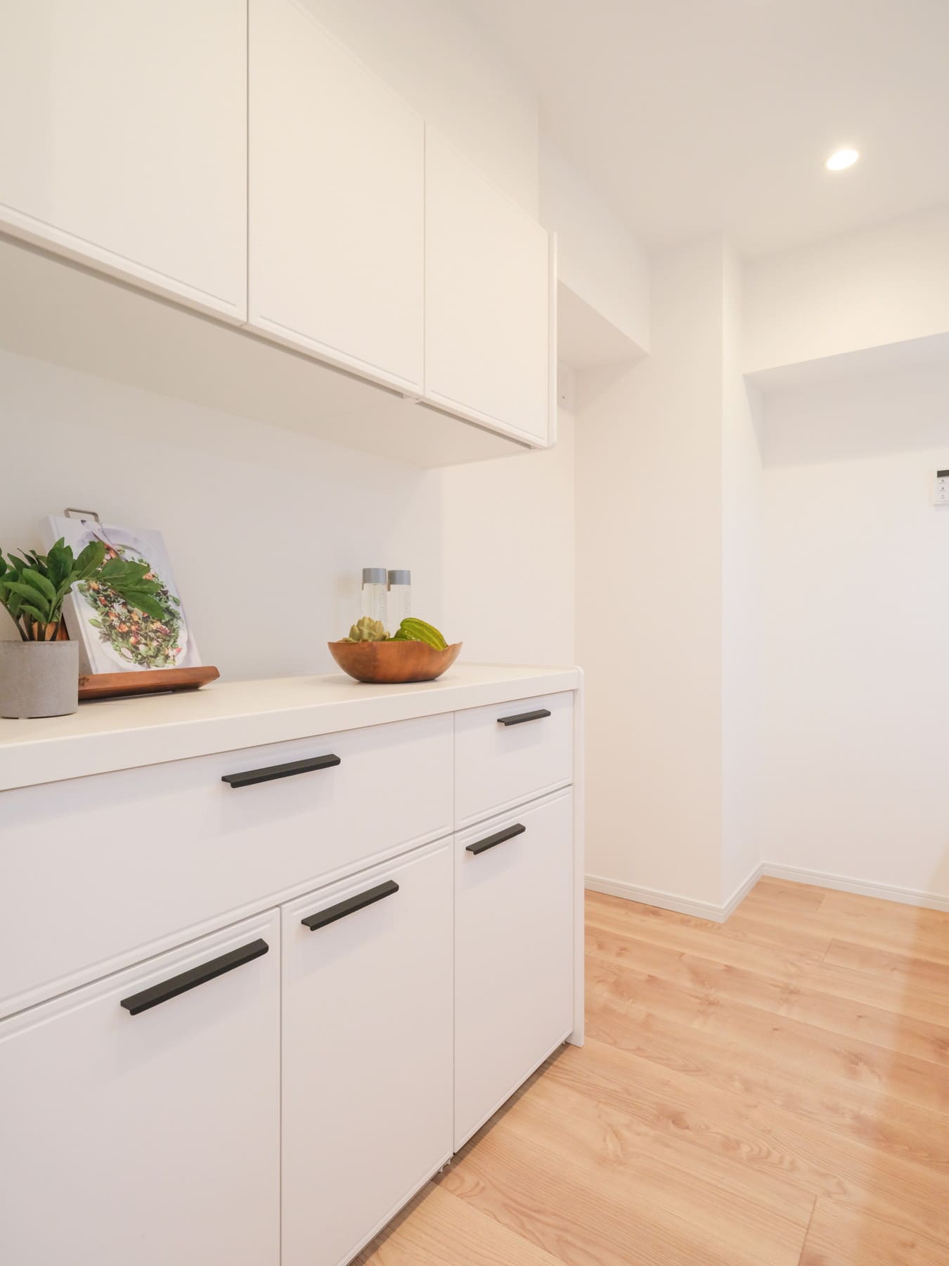 キッチンの背面側にはカップボードが備え付けられています。調味料や食器などを収納できるだけでなく、電子レンジなどを置くこともできるので便利です。