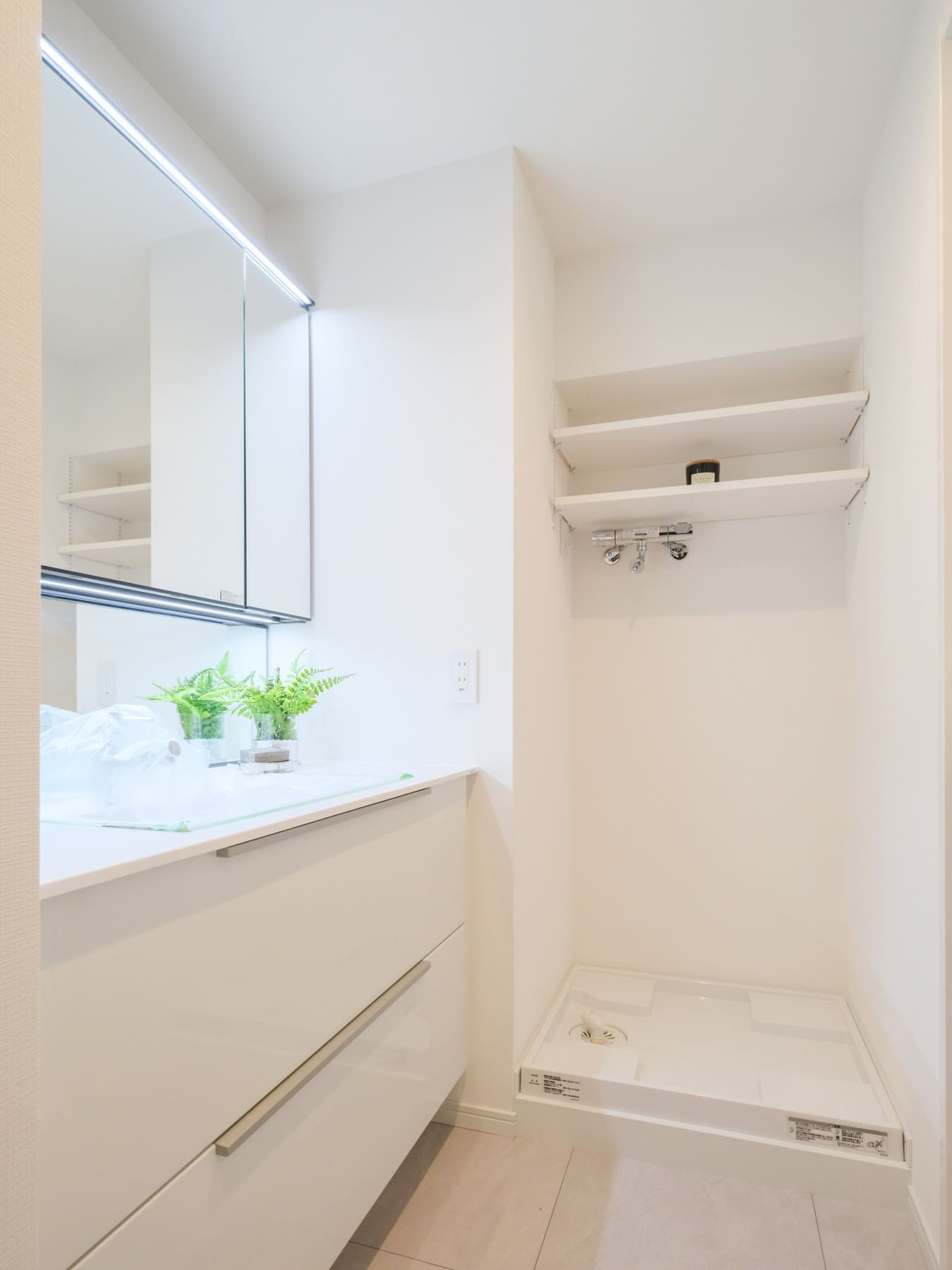 TOTO製の洗面化粧台は、三面鏡の中に化粧品などが収納できて使い勝手良好。水栓の背面側も鏡になっているので、座りながらや背の低いお子さまでも鏡が見やすくなっています。