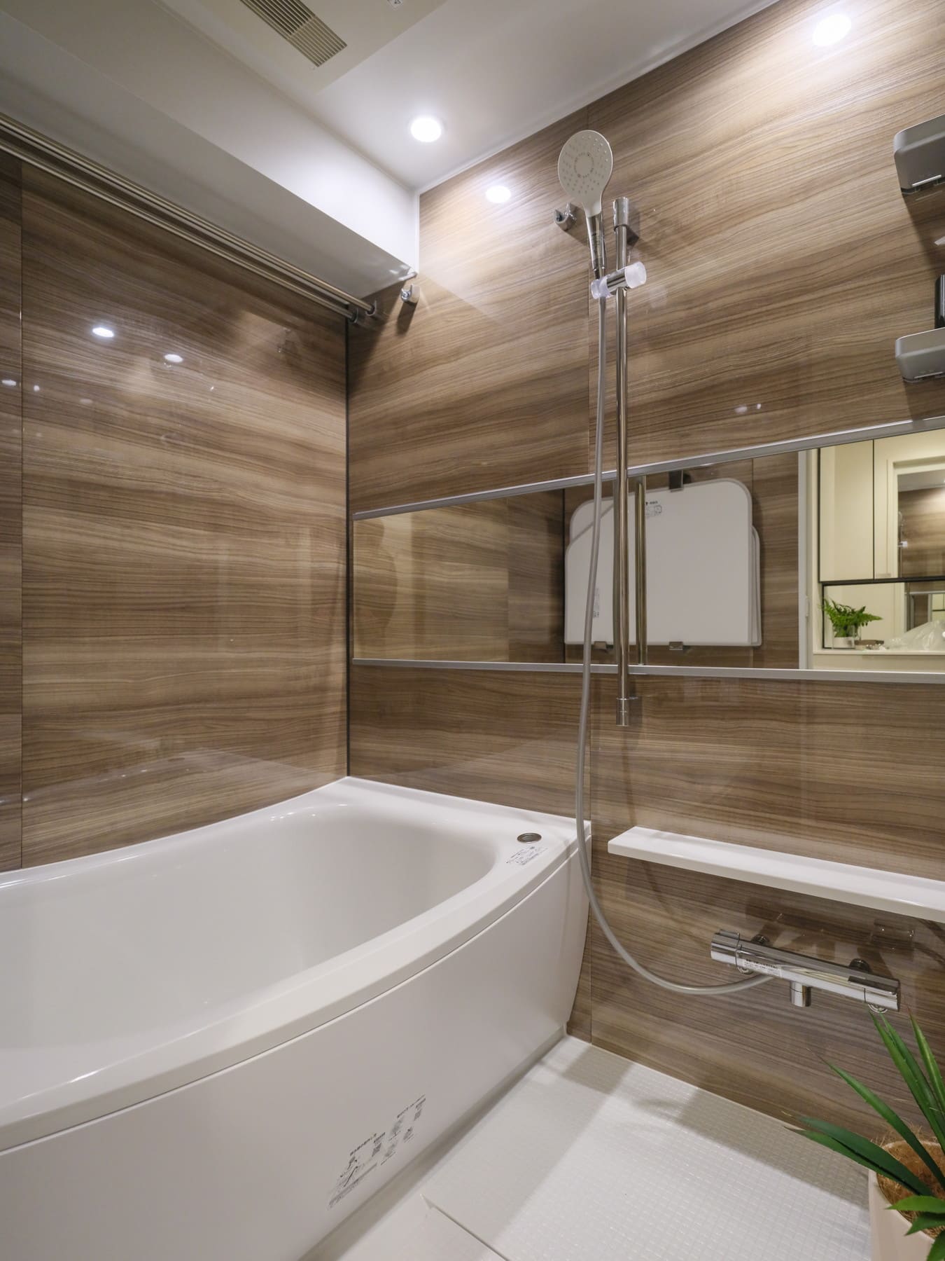 TOTO製のバスルームは、ブラウンの壁パネルが落ち着いた雰囲気を演出してくれています。お風呂にゆっくり浸かるのが好きという方に嬉しい追い焚き機能を搭載。家族の入浴時間がずれてしまっても安心です。また、浴室換気乾燥機付きのため、雨の日の洗濯物にも困りません。