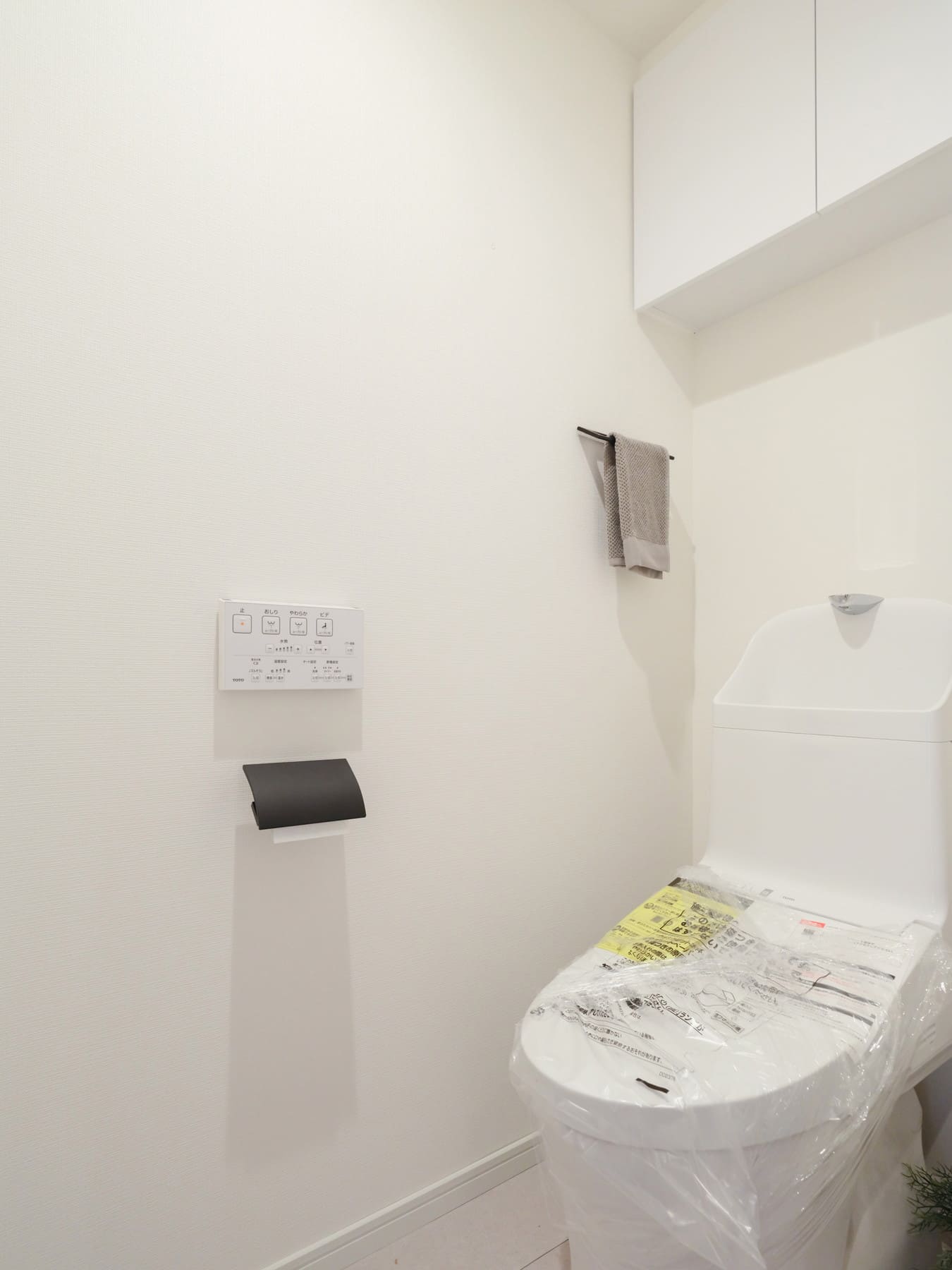 TOTO製のトイレは、ウォシュレット一体型です。上部には吊戸棚が設置されているので、トイレットペーパーや掃除用具なども収納ができますよ。