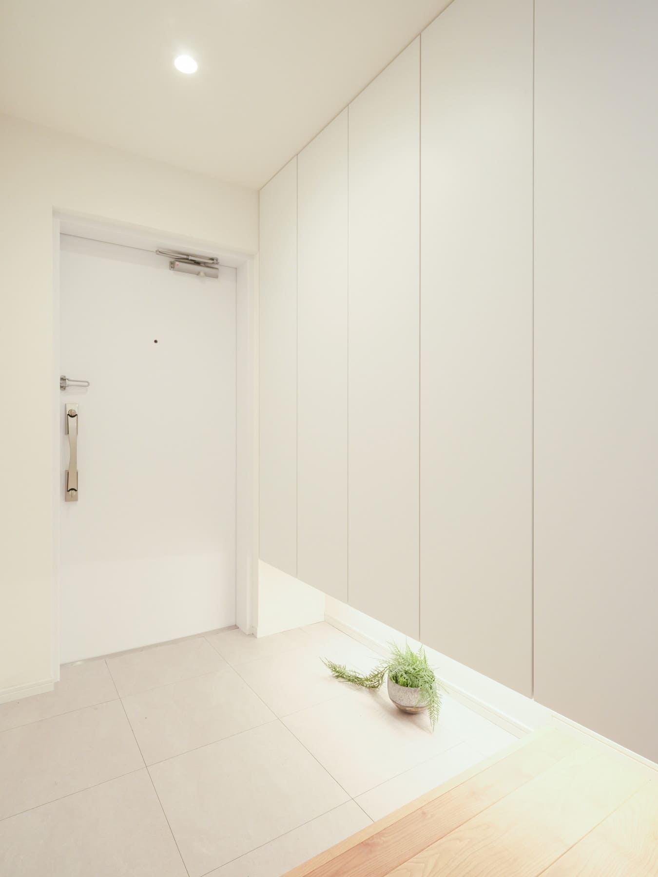 白を基調とした清潔感のある玄関です。入って左側にはシューズボックスが備え付けられており、高さがありますがフロートタイプのため圧迫感を与えません。フットライトの光が優しく足元を照らしてくれるのも◎。