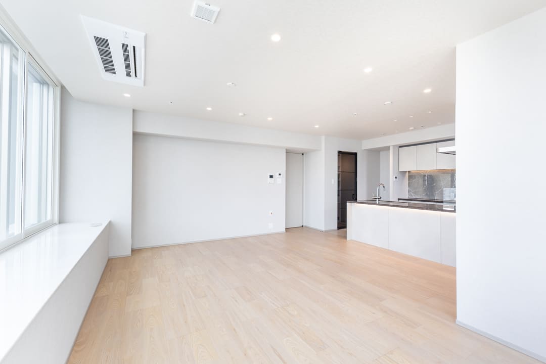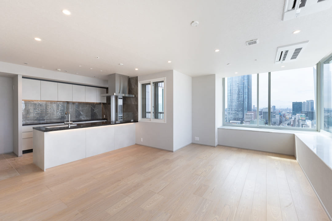 二面採光で窓に囲まれた、開放感あふれるリビングダイニング。キッチンスペースを含めて約23.8帖のゆとりある空間です。窓の先には青空と都心のビル群、木々の緑が広がり、都心のダイナミックな景観とやわらかな緑を一望。景色を眺めながら、ゆったりとくつろぎの時間を過ごせそうです。