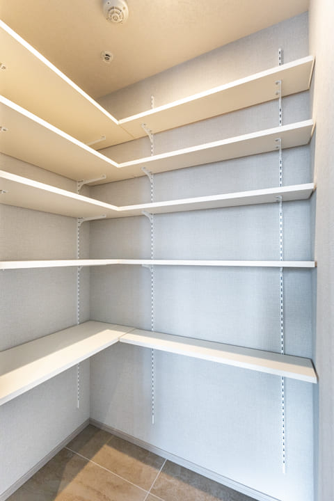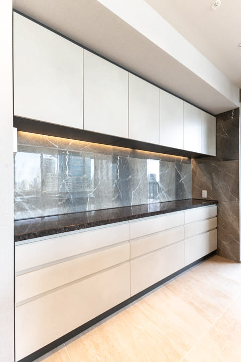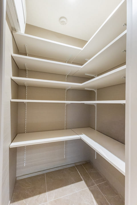 背面にはキッチンとデザインを揃えたカップボードを設置。統一感のある美しい空間を保ちながら、食料品や食器類をすっきり収納できます。カウンターにはコンセントも設けられており、家電の使用にも便利。さらに、パントリーも備え、キッチン家電や日用品ストックの収納に重宝しそうです。
