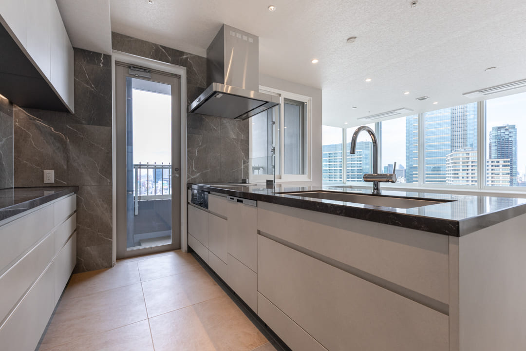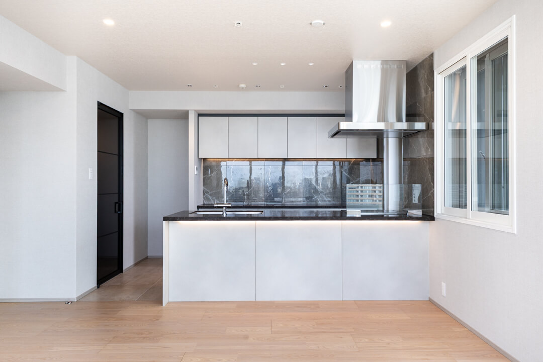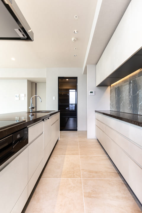 白と黒のコントラストが映える、スタイリッシュなキッチン。リビングダイニングを見渡せる開放的な対面タイプで、料理をしながら家族やゲストとの会話も自然と広がります。コンロ前にはガラスガードを設け、リビング側への油跳ねにも配慮された設計。バルコニーに面しており、明るさと奥行きを感じられる心地よい空間です。