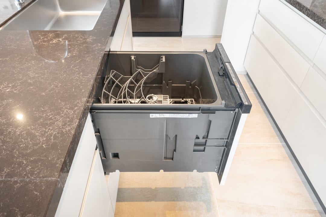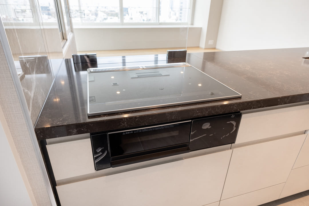 設備面では3口のIHクッキングヒーター&食洗機を完備。IHはスイッチ操作で火力調節を直感的に行うことができ、細かな調整もしやすい点が特徴です。表面に凹凸が少ないため汚れがたまりにくく、日々のお手入れもスムーズに行えます。さらにディスポーザーを搭載していて、生ゴミ処理の手間を軽減し、気になる臭いの発生も抑えてくれます。調理から後片付けまでをスムーズにこなすことができ、快適なキッチン時間になりそうです。