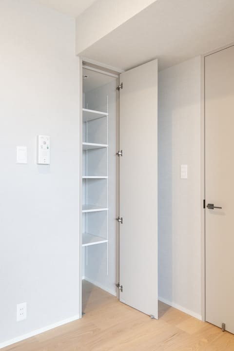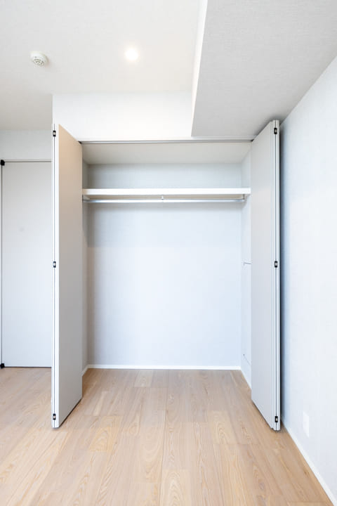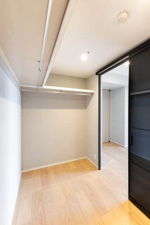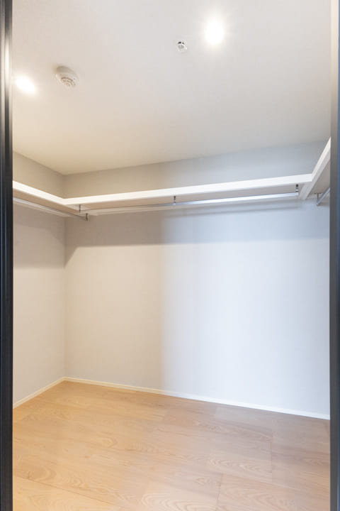 WIC(ウォークインクローゼット)と可動棚を備え、豊富な収納も魅力。WICにはコの字型にハンガーパイプが設置されていて、大切な洋服をたっぷり収納可能です。トランクケースや季節家電などの大きな荷物もすっきり収まり、居室空間を有効に活用できます。